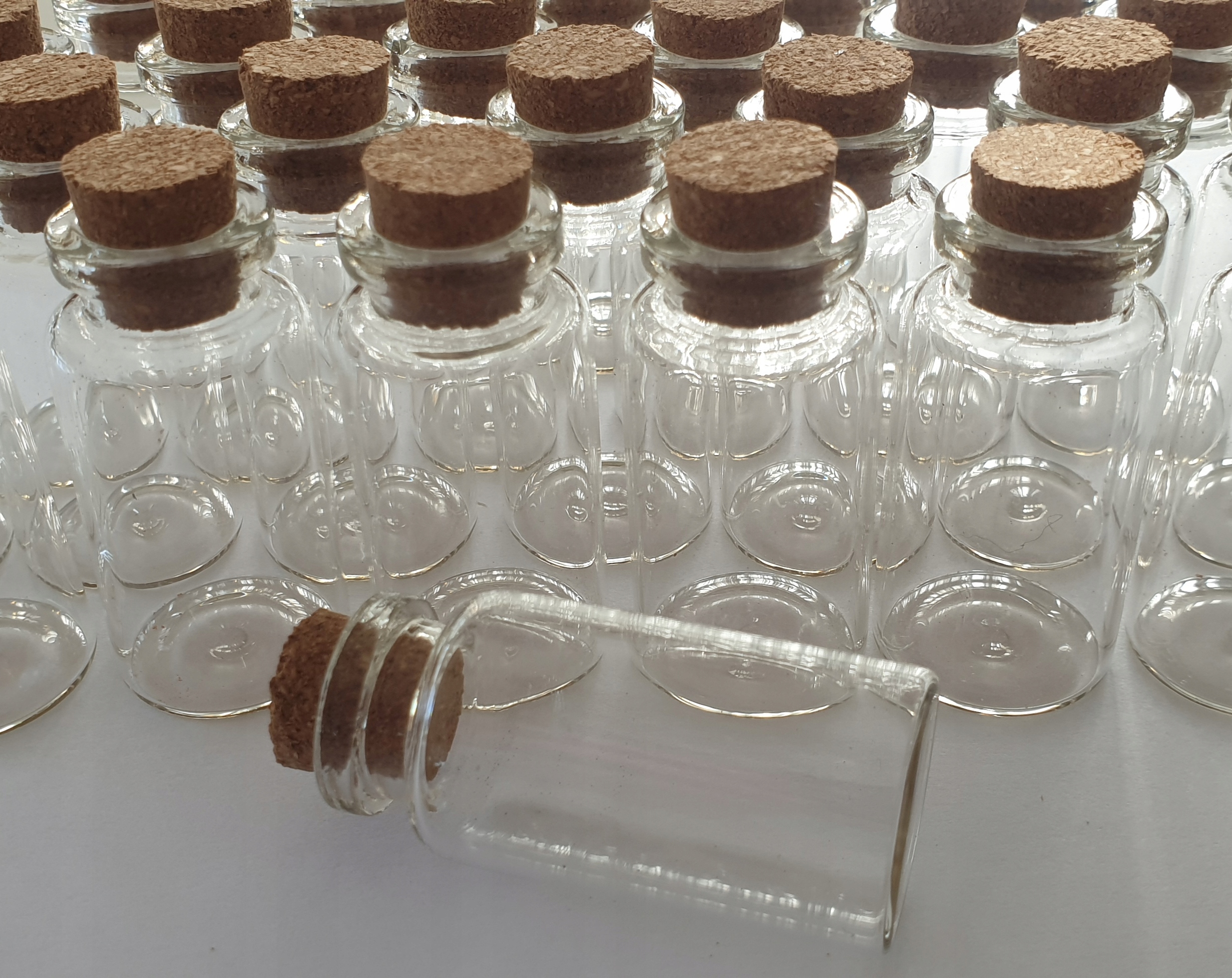 Набор из 50 стеклянных, прозрачных бутылок с пробками.