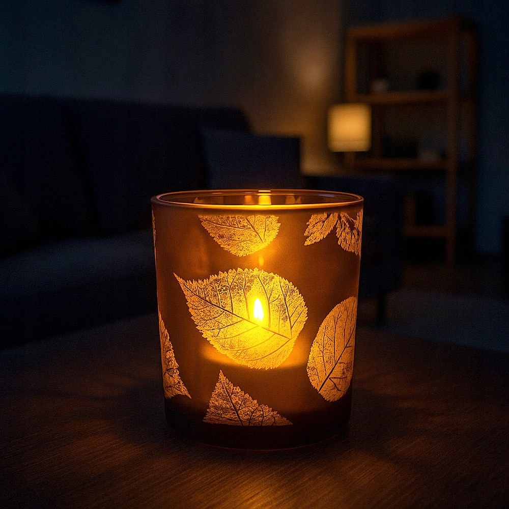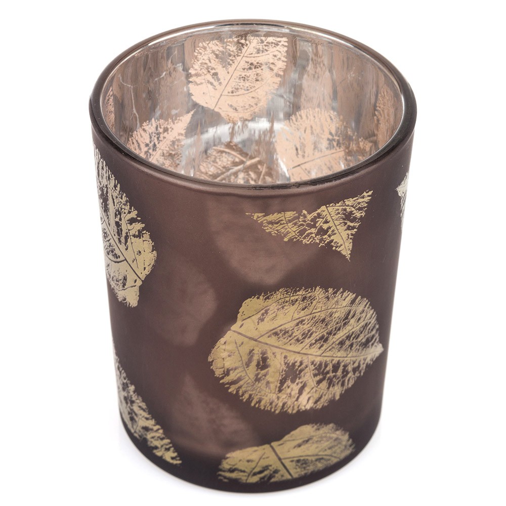 Введите тепло и стиль в свой дом благодаря нашему элегантному стеклянному свечению с нежным листовым мотивом. Изготовлен из высококачественного стекла, с матовой отделкой в оттенках коричневого, украшенный золотистым узором листьев, идеально сочетается с классическими и современными интерьерами. Интерьер подсвечника покрыт зеркальным отражением, чтобы выявить как можно больше света. Идеально подходит для свечей.