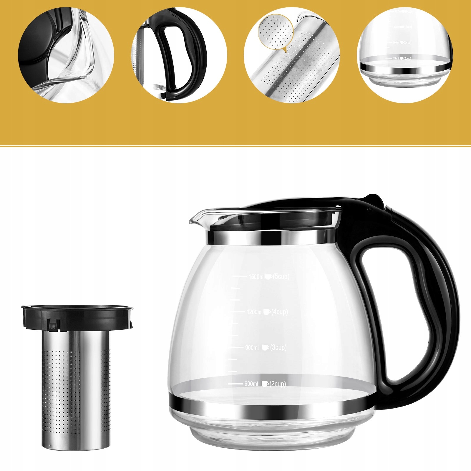 Большой чайный кувшин, сделанный из прочного стекла , с пластиковым корпусом и стальным пивоваром. Кувшин из стекла не поглощает запахи или красители. Кроме того, он устойчив к высоким температурам и повреждением, вызванным ежедневным использованием
