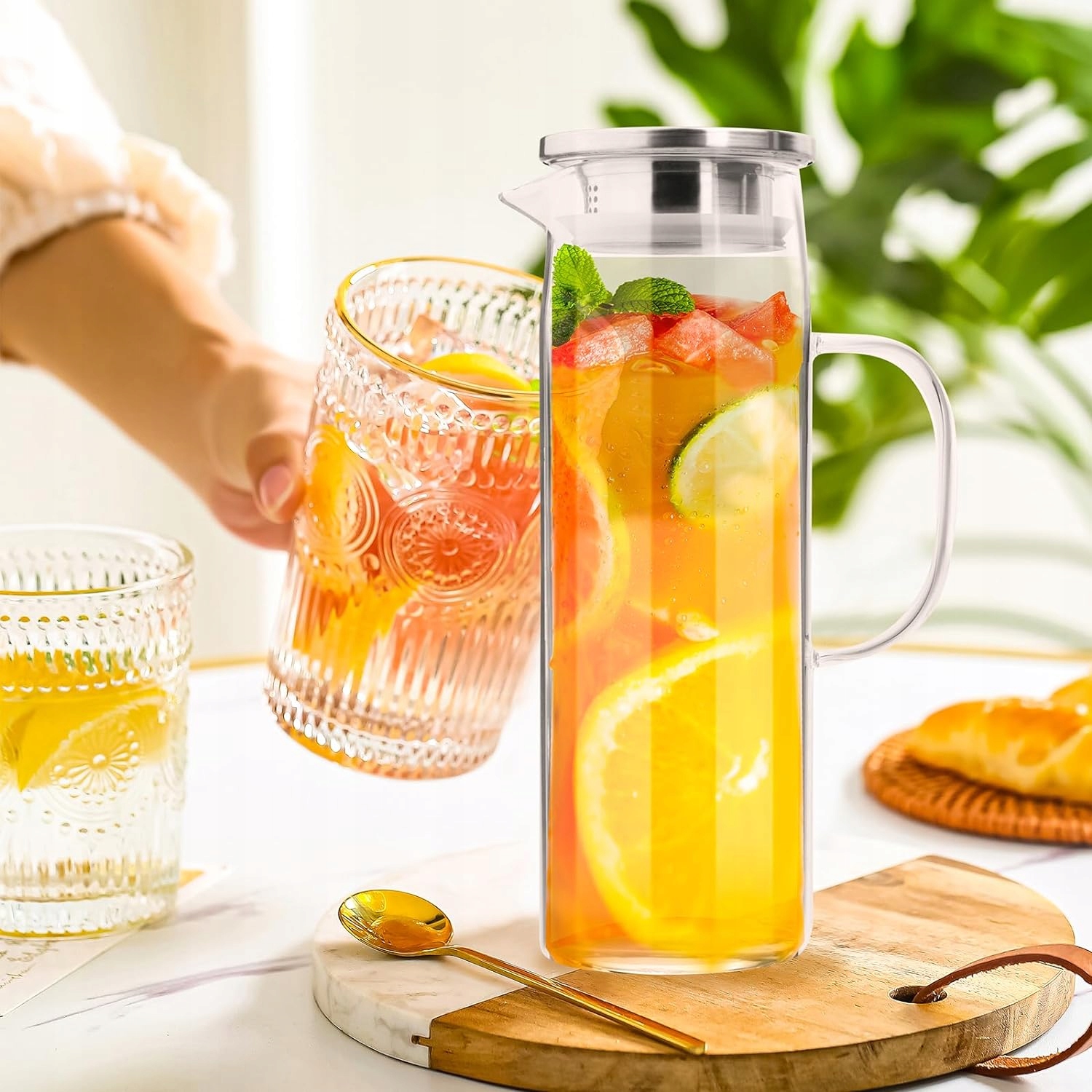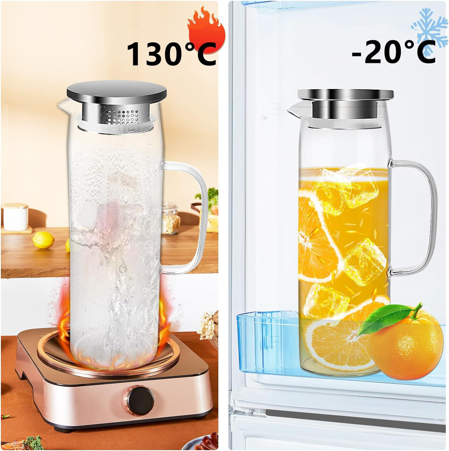 Этот стеклянный кувшин состоит из высококачественного бороцерального, свободного от BPA и без токсинов, долговеченного, резистентного температуры -20 ~ 130 ℃/-4 ° F -302 ° F, лучший выбор. Толстое стекло обладает высокой воздействием и сопротивлением высоким и низким температурам. Его можно безопасно использовать в холодильниках и печи.
