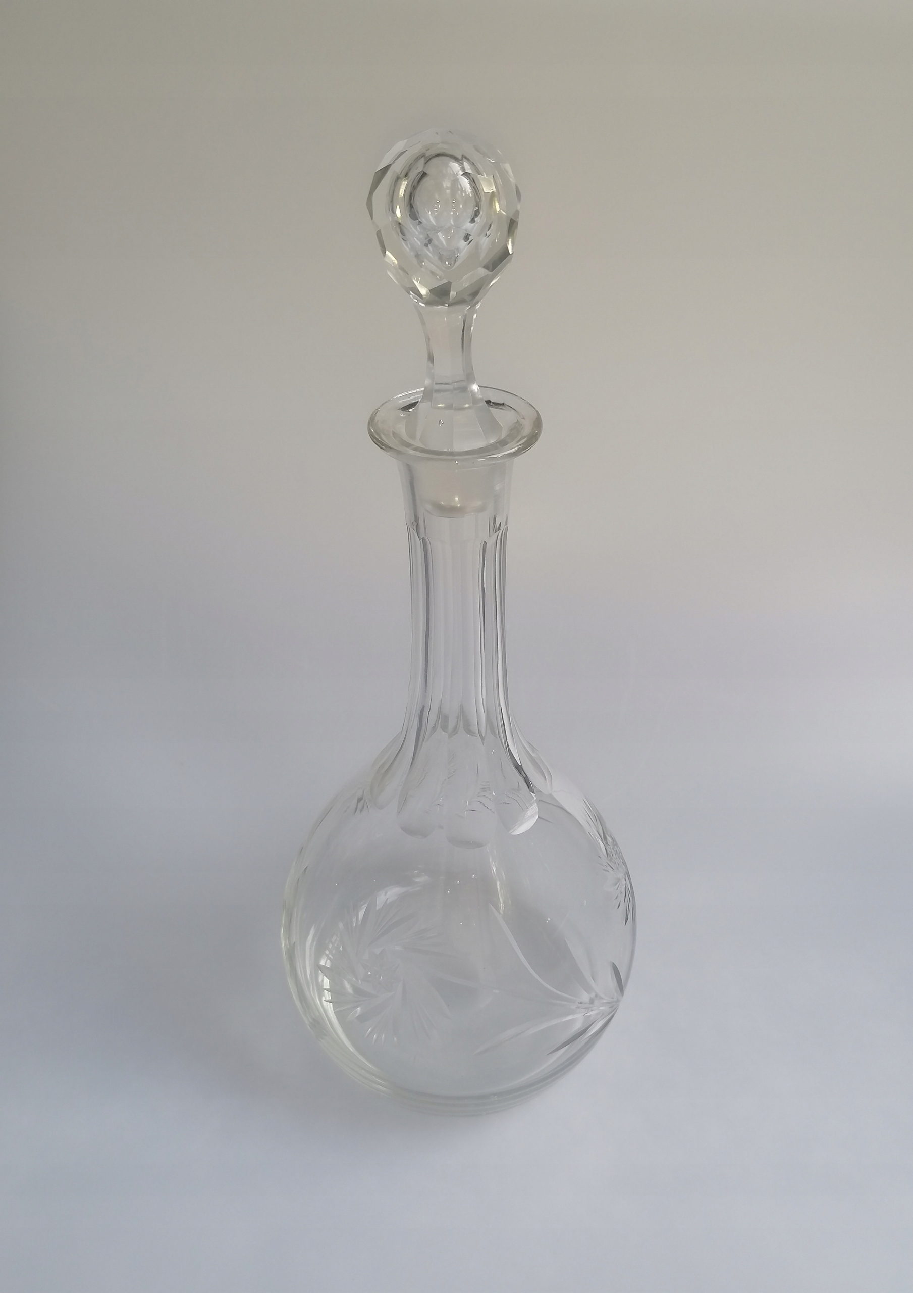 Продаю небольшой и аккуратный графин для алкоголя. Выдувное стекло ручной работы с линзой внизу. Продолговатая шея с изящными гранями, живот с декоративной гравировкой. Обращает на себя внимание оригинальная, ромбовидная хрустальная пробка с красивым воздушным пузырем, заключенным во всю ее куполообразную форму.