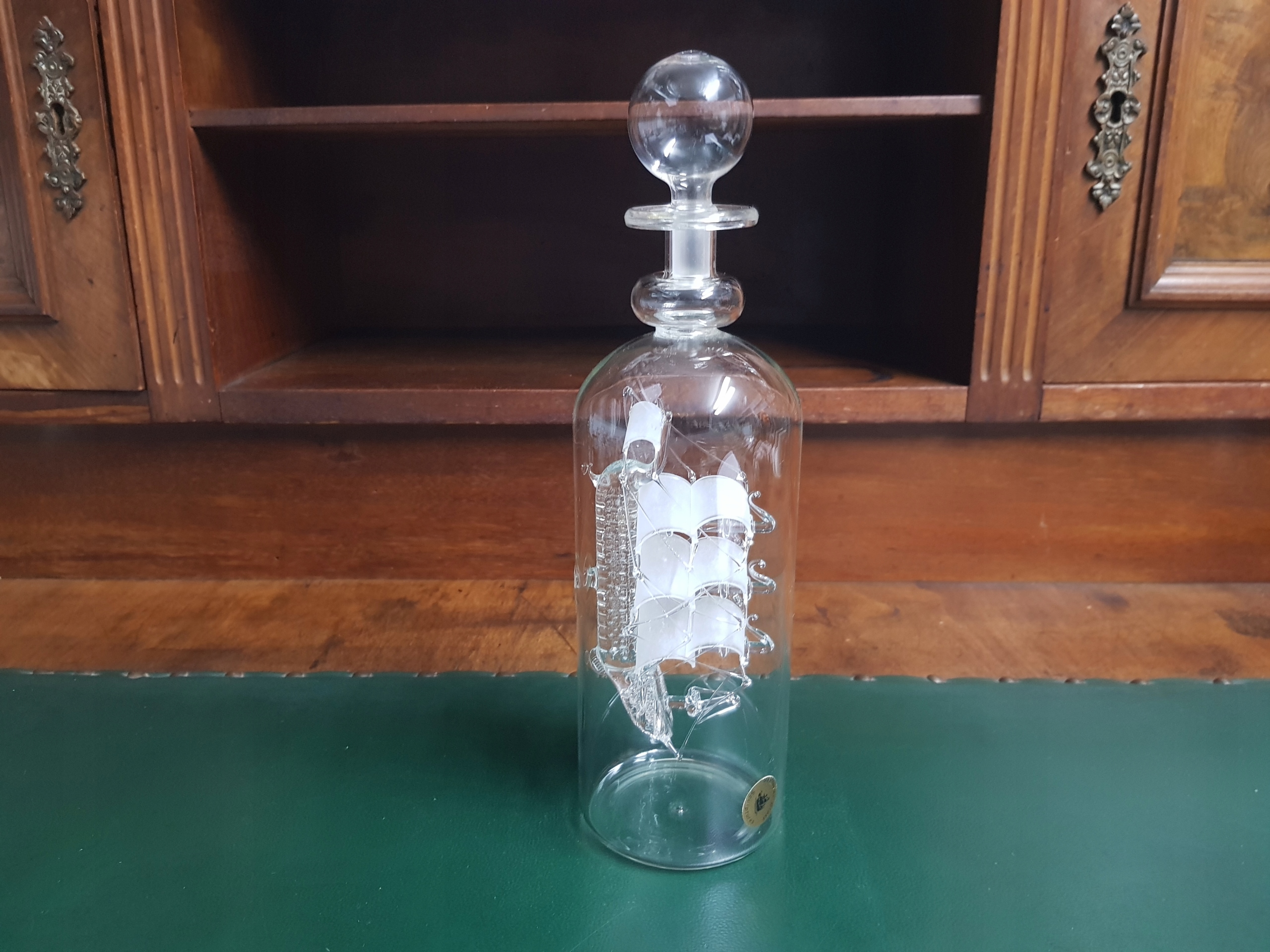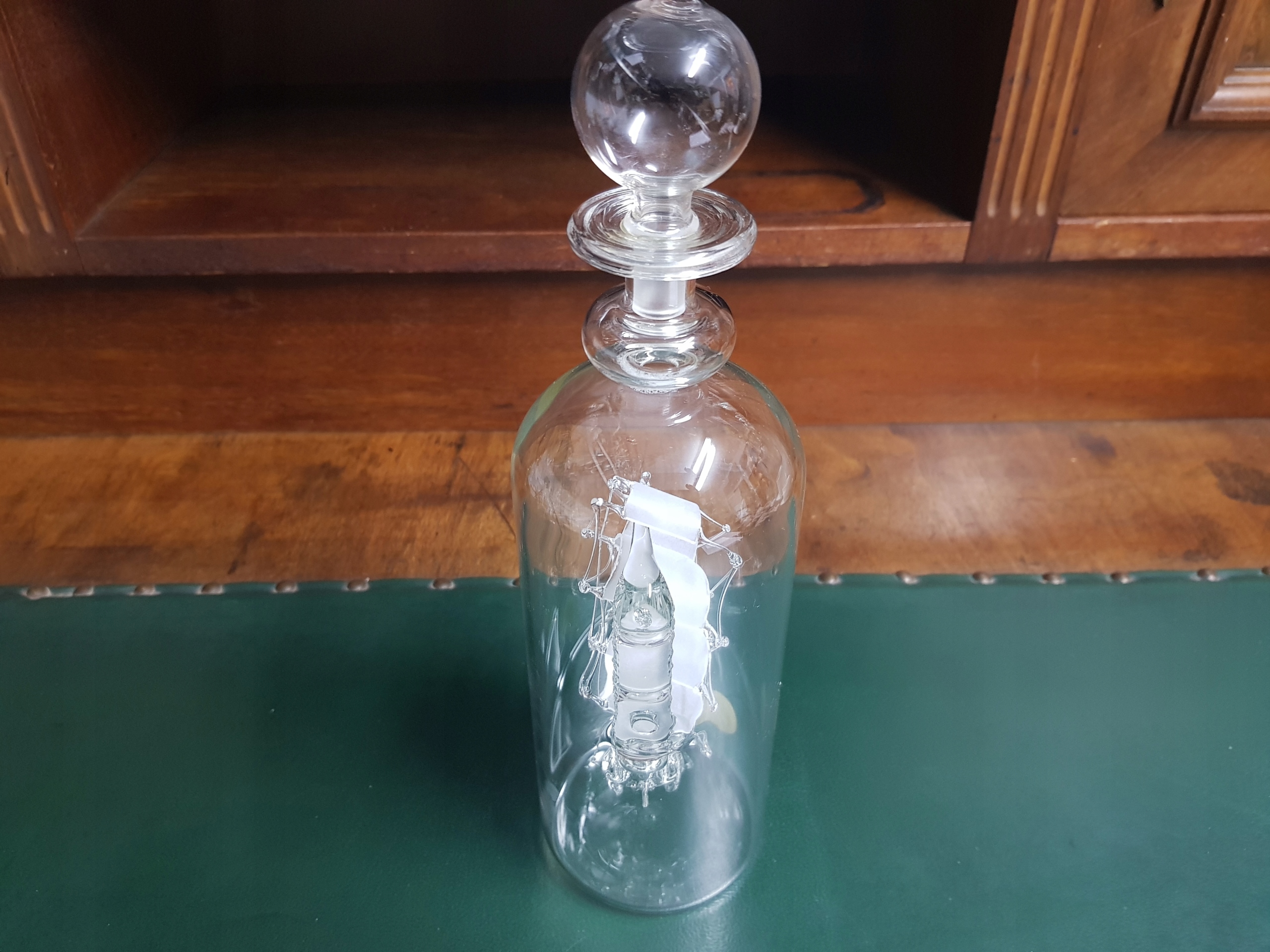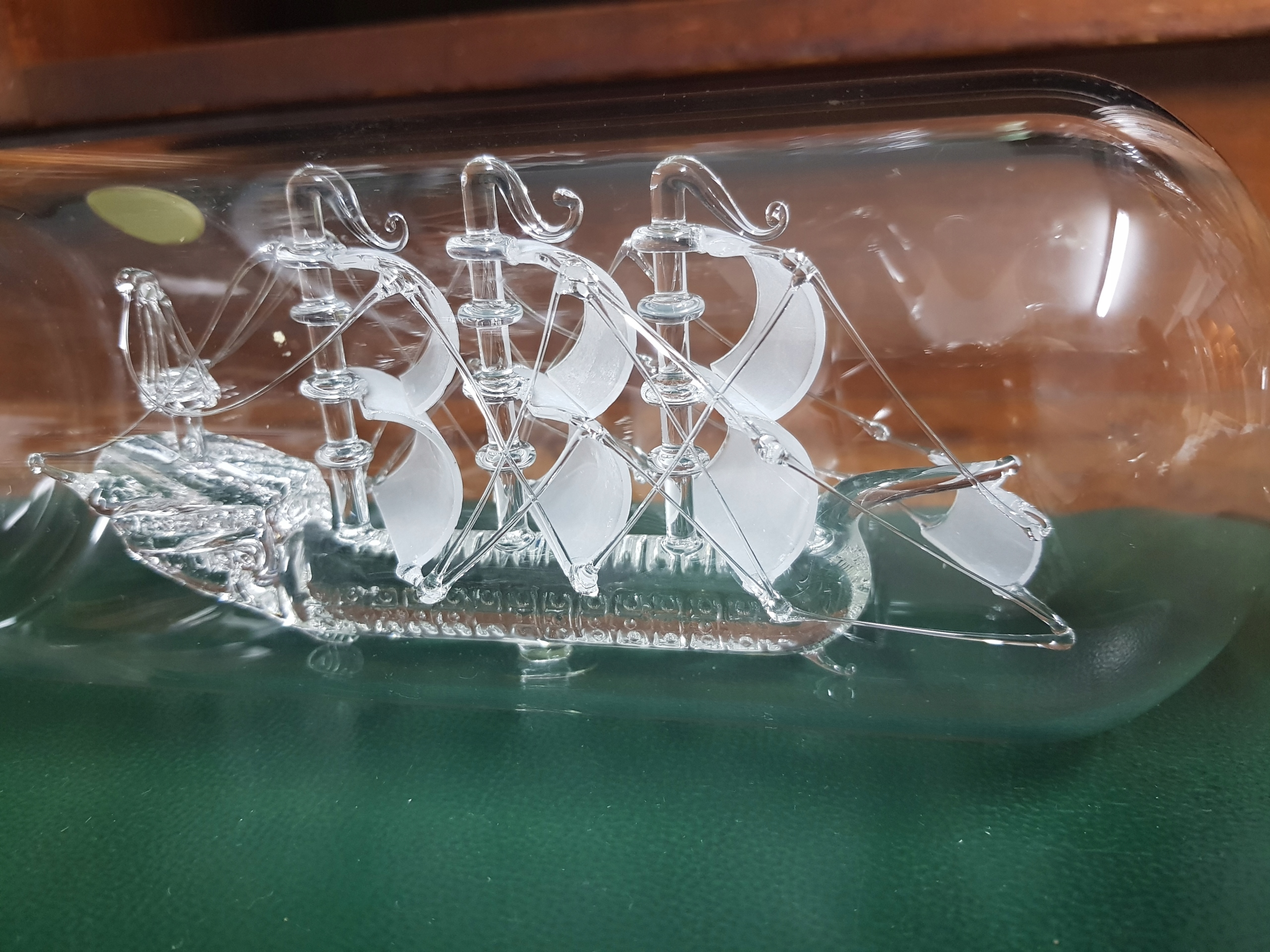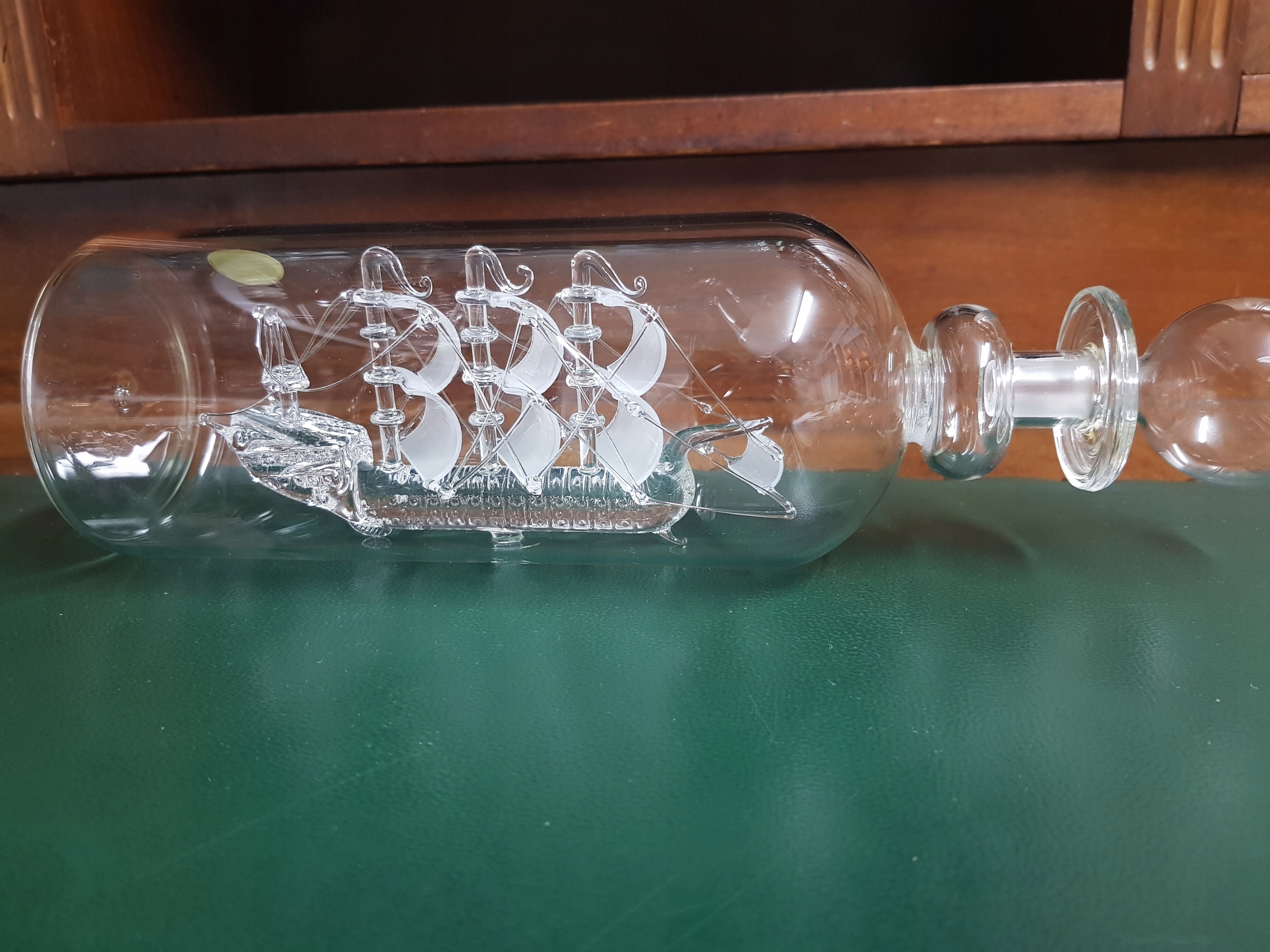 Предмет аукциона — стеклянный парусник, заключенный в бутылку. Бутылка имеет ровное место в основании, что удерживает ее в горизонтальном положении.