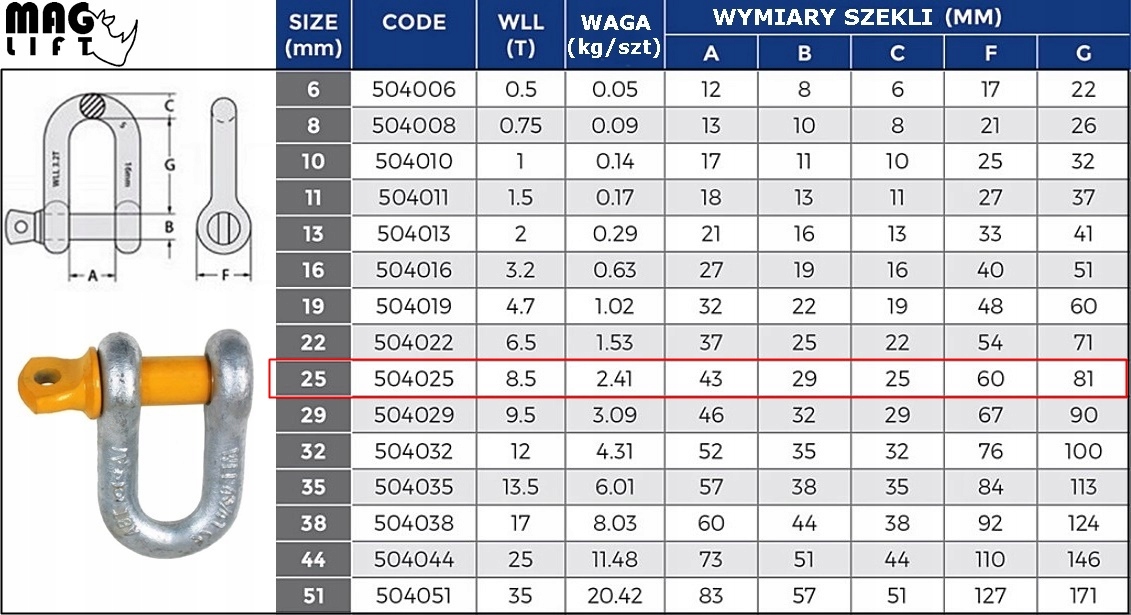 пример: дужка согласно DIN 82101, диаметр штифта 22 м, максимальная прочность 2 т, высокопрочная дужка согласно PN-EN13889 > при диаметре пальца 22 мм грузоподъемность 4,75 т.