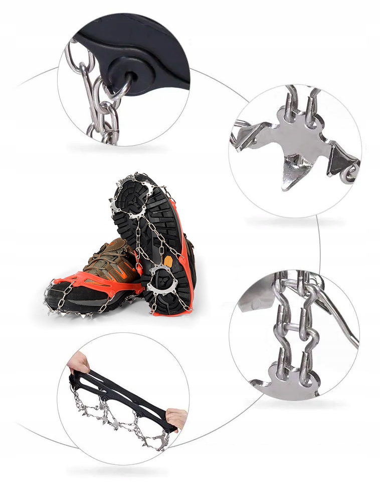 Чтобы их использовать, просто затяните резиновый ремешок и наденьте их на подошву обуви. Идеально подходят для походов в горы или по снегу. У них хорошее сцепление, поэтому гулять по горам или лесу даже в неблагоприятных условиях одно удовольствие.