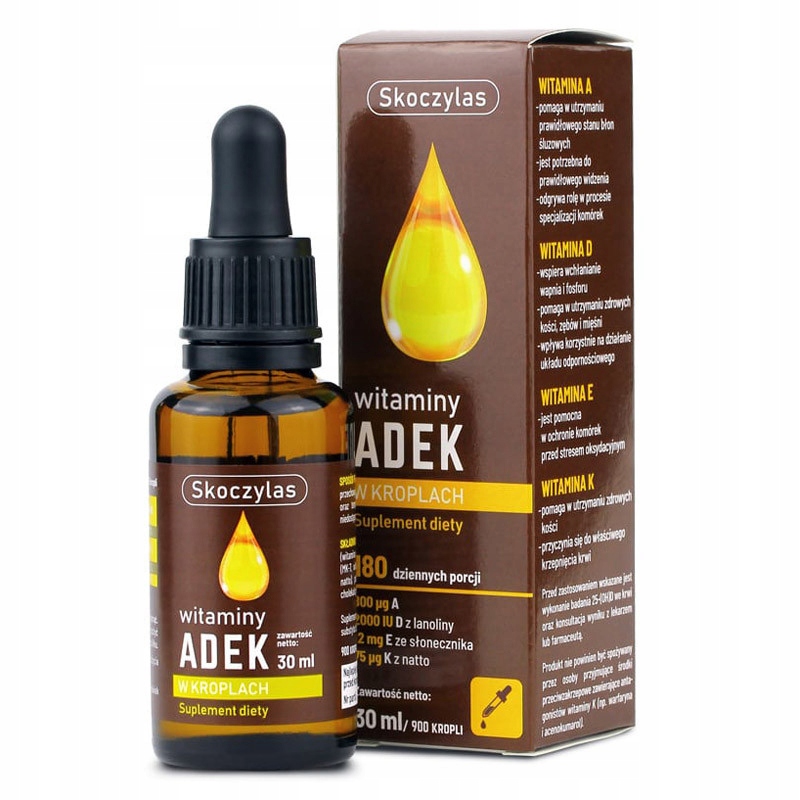 SKOCZYLAS Витамины ADEK в каплях содержит витамины A, D, E и K. Этот витаминный комплекс в первую очередь используется для пополнения организма веществами, необходимыми для его правильного функционирования. В настоящее время использование добавок популярно не только среди спортсменов, но и среди людей, которые хотят бороться за свое здоровье и хорошее самочувствие.
