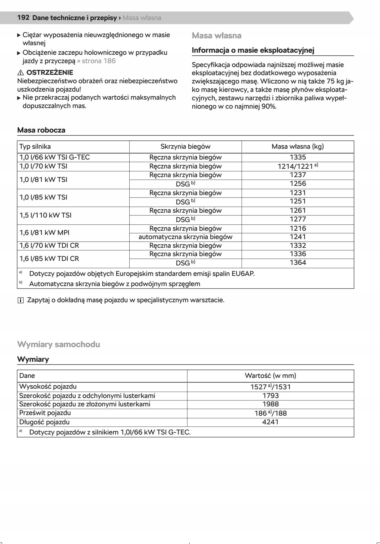1,0 л/66 кВт TSI G-TEC Механическая коробка передач 1335 1,0 л/70 кВт TSI Механическая коробка передач 1214/1221 а) 1,0 л/81 кВт TSI Механическая коробка передач 1237 DSG b) 1256 1,0 л/85 кВт TSI Механическая коробка передач 1231 DSG b) 1251 1,5 л/110 кВт TSI Механическая коробка передач 1261 DSG b) 1277 1,6 л/81 кВт MPI Механическая коробка передач 1216 автоматическая коробка передач 1241 1,6 л/70 кВт TDI CR Механическая коробка передач 1332 1,6 л/85 кВт TDI CR Механическая коробка передач 1336 ДСГ б) 1364