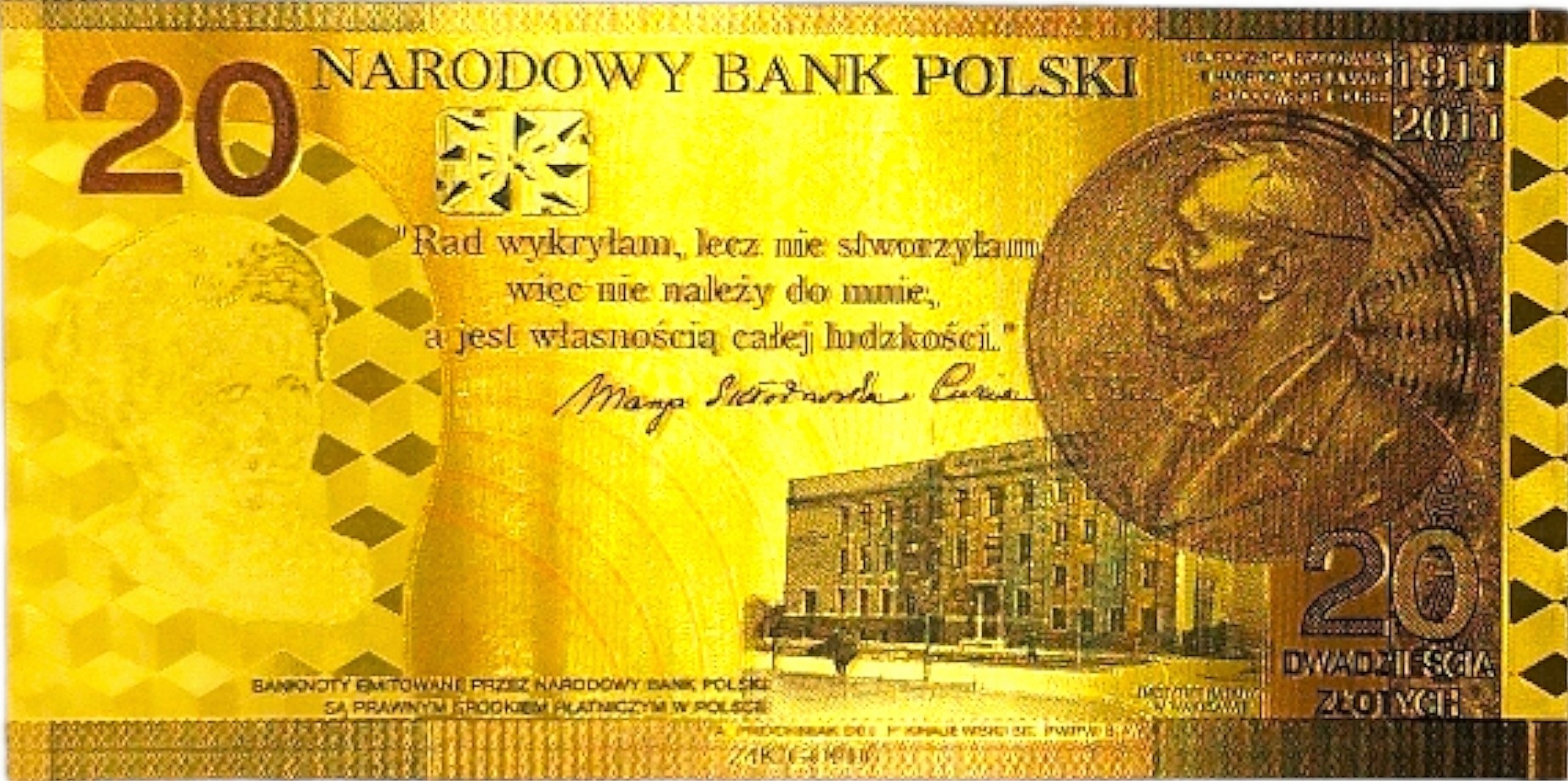 25 ноября 2011 г. Национальный банк Польши представил банкноту коллекционера с деноминацией PLN 20, которая ознаменовала выдающиеся достижения Марии Склодовской-Кюри. Эта банкнота транслировалась по случаю 100-летия премии Марии Склодовской Нобелевской премии в области химии. H2>