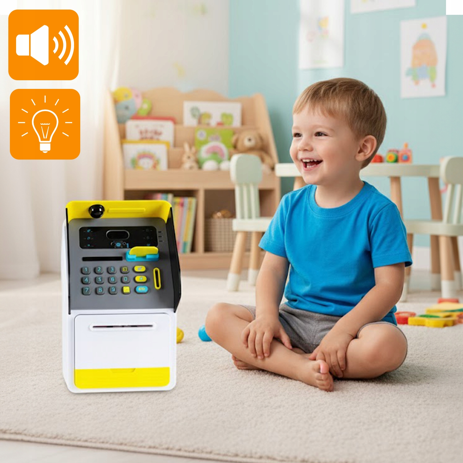 Электронная копилка с автоматическим изъятием банкнот, ПИН-кодом и световыми и звуковыми эффектами позволит ребенку почувствовать себя пользующимся настоящим банкоматом. Благодаря этому экономия становится увлекательным развлечением, а хорошие финансовые привычки развиваются совершенно естественным образом.