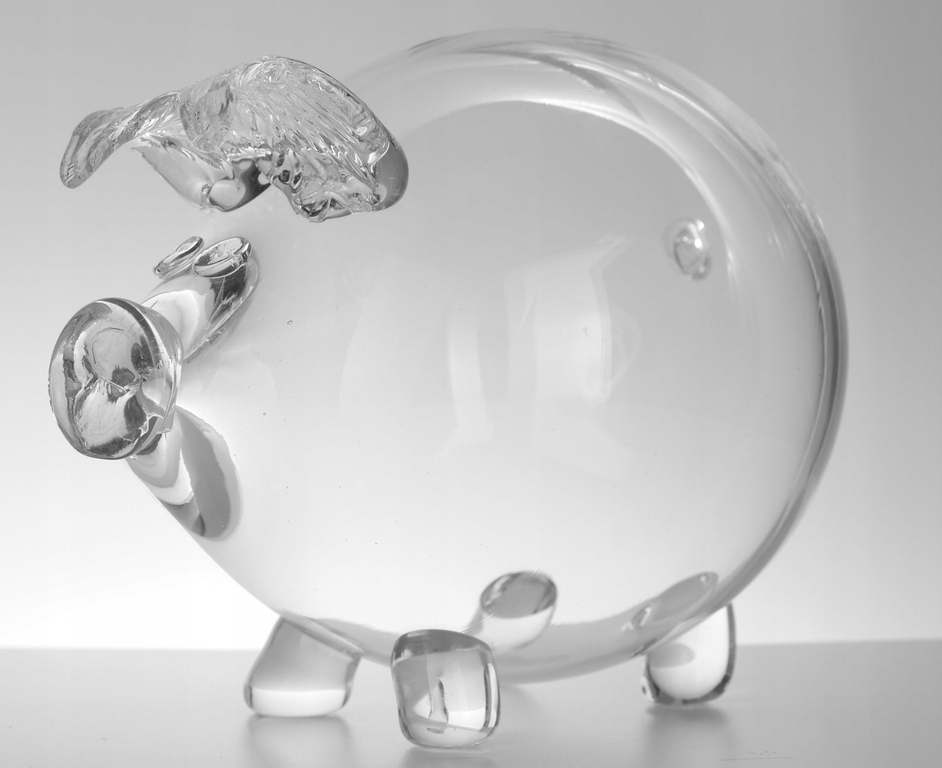 Копилка. Изготовлен из толстого стекла с красивой, бесцветной и блестящей стеклянной поверхностью. Польский продукт. У свиньи есть отверстие – прорезь вверху для вставки монет. Единственный способ получить сдачу — сломать ее.
