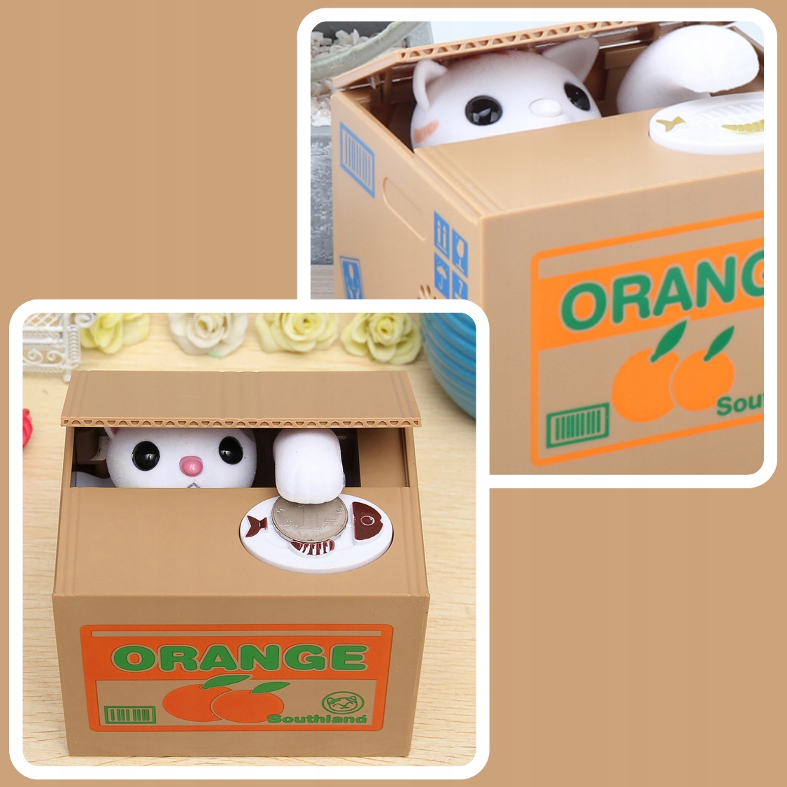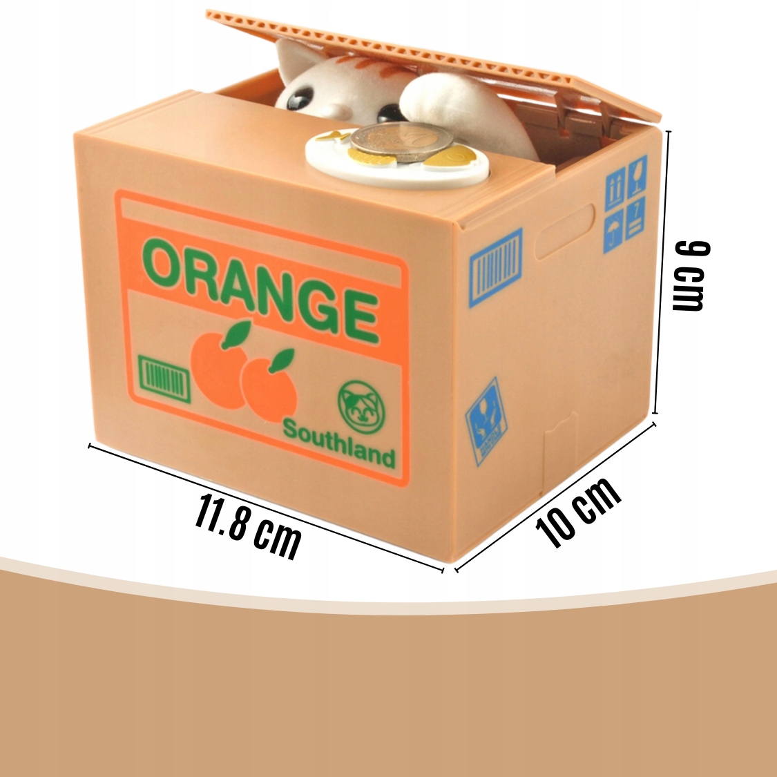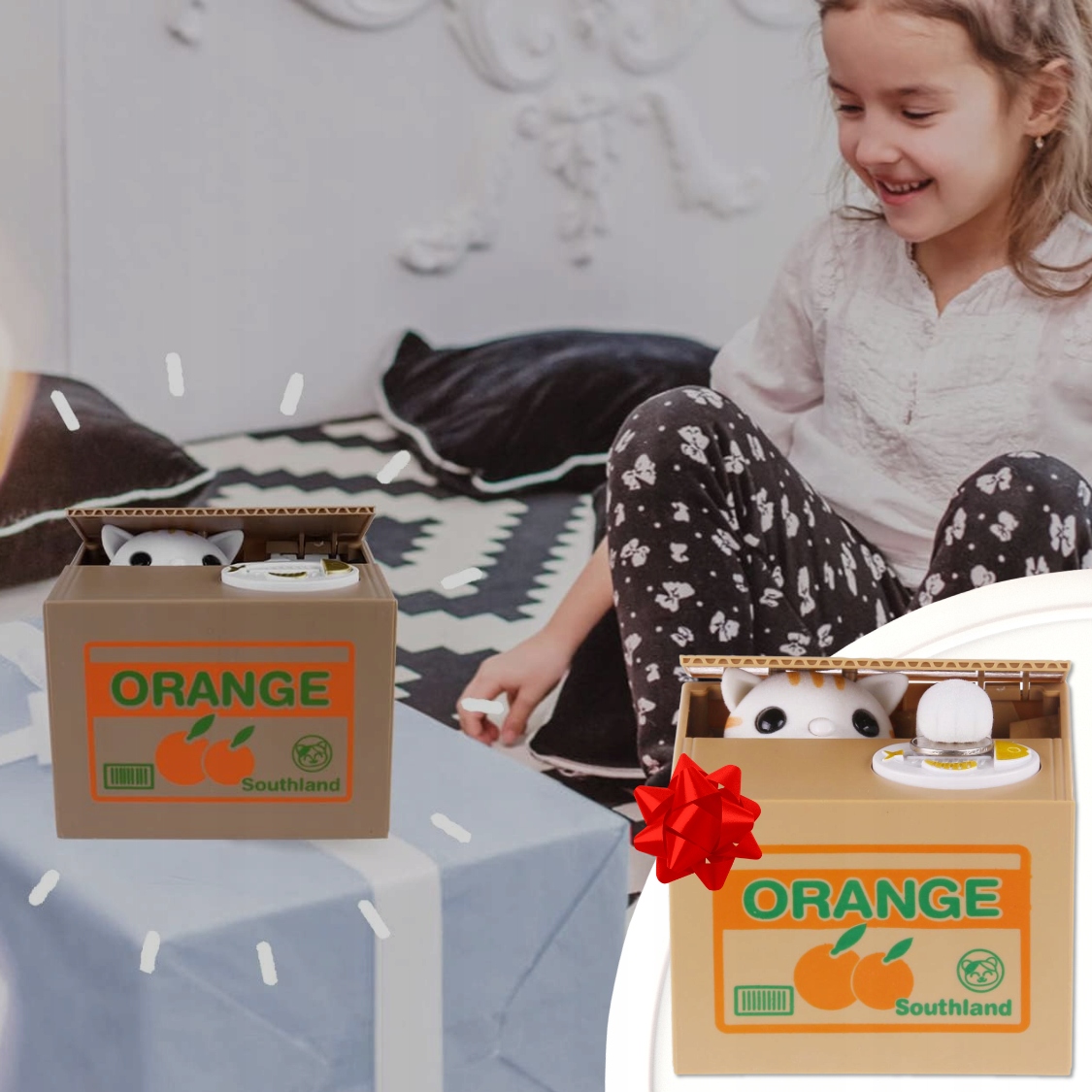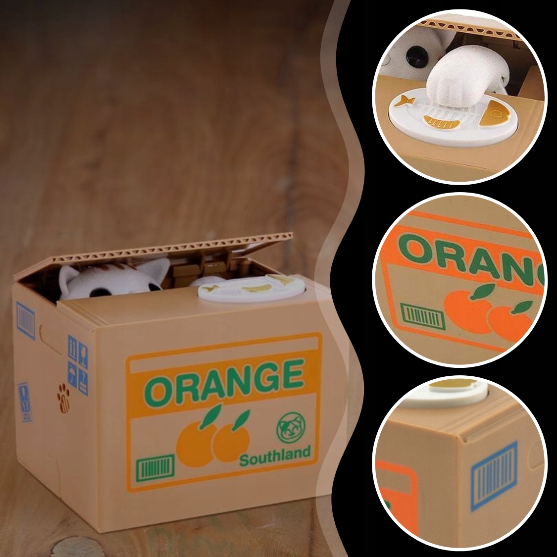Котёнок не только собирает монеты, но и двигается и издает радостные звуки. Положив монету на тарелку, котенок протягивает лапу, берет монету и бросает ее в коробку, а затем мяукает. Это очень весело, побуждает вас экономить!