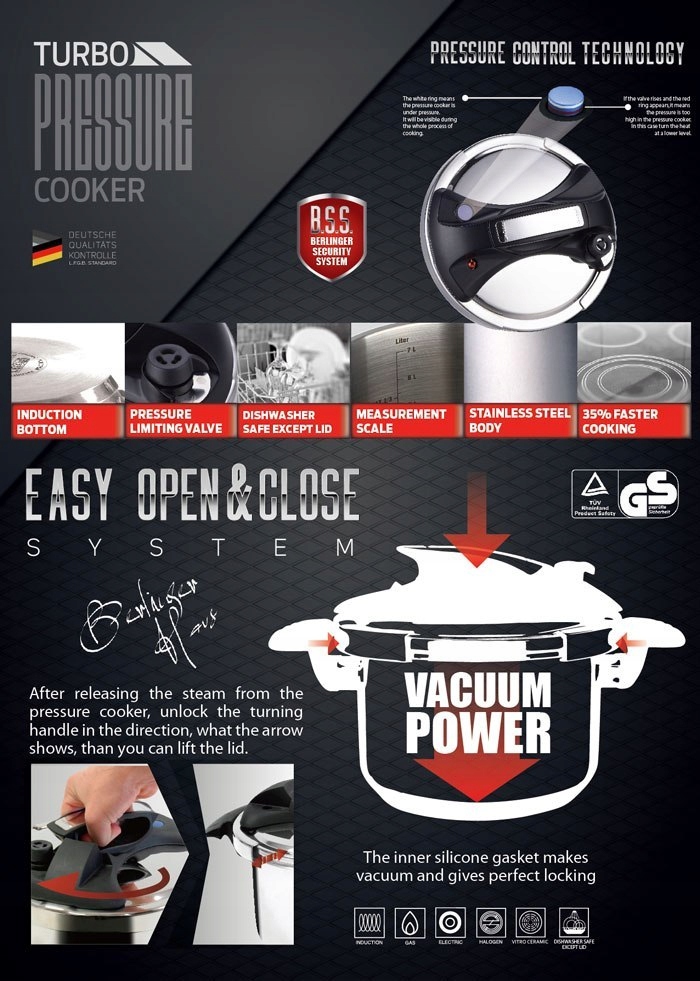 С этой удобной скороваркой , вы сможете приготовить здоровую пищу с низким содержанием жира за треть времени по сравнению с традиционным приготовлением пищи. Одним из наиболее важных преимуществ является то, что вы можете готовить полезные блюда с низким содержанием жира, сохраняя при этом необходимые витамины и питательные вещества и экономя при этом энергию! Нержавеющая сталь 18/10 не вступает в реакцию с приготовленными продуктами. Эта скороварка имеет тройную защиту — клапаны регулирования давления, два независимых клапана выравнивания давления и предохранитель на ручке.
