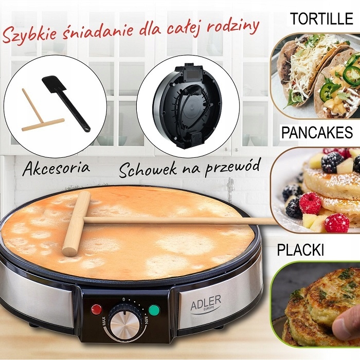 Электрическая блинница AD3058 от компании ADLER мощностью 1600 Вт — кухонный прибор — профессиональное бытовое оборудование. Диаметр нагревательной пластины устройства составляет 30 см. Антипригарное покрытие нагревательной пластины, форма и высокий край, предотвращающий растекание теста, облегчают жарку блинов, а также лепешек, оладий и дерунов. Устройство позволяет плавно регулировать температуру, а два световых индикатора сигнализируют о готовности оборудования к работе. В зависимости от ваших вкусовых предпочтений, установив более низкую температуру, блины получатся светлыми, а более высокая температура – более темными и хрустящими. В комплект также входят аксессуары для раскатки теста и переворачивания блинов. Устойчивые резиновые ножки не позволяют блиннице скользить по столешнице. Корпус из нержавеющей стали и отделение для шнура питания гарантируют, что устройство прослужит нам долгие годы и его очень легко хранить даже в вертикальном положении. Шнур питания длиной 75 см обеспечит беспроблемное и удобное подключение оборудования к электросети.