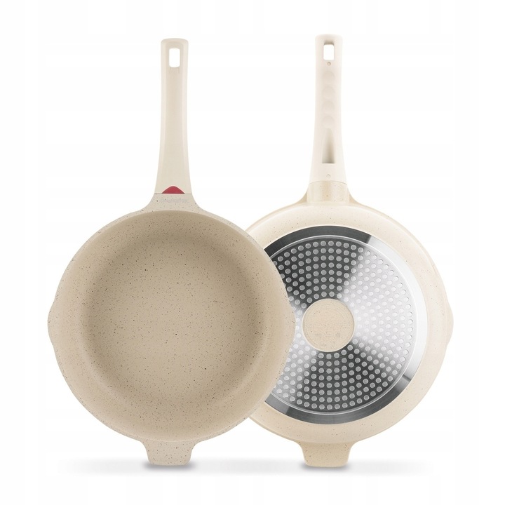 Глубокая сковорода Konighoffer Creamy Marble 28 x 8,5 см изготовлена из алюминия. Для его создания использовалась технология гомогенного литья под давлением. Благодаря этому он идеально сбалансирован и очень прочен с точки зрения механических и термических свойств. По краю сосуда имеются два носика. Они помогут вам разлить соус и слить лишнюю воду или вытопленный жир. Внутренняя часть сковороды покрыта антипригарным покрытием MARBLE PLUS. Его высокое качество, твердость и трехслойная структура были разработаны для обеспечения высокой устойчивости к царапинам. Он также имеет маркировку PFOA Free. Экономия энергии достигается благодаря ферромагнитному индукционному дну. Благодаря этому сковороду Creamy Marble с высокими бортиками можно использовать на любой плите. Антипригарное покрытие каменного типа также позволяет жарить с небольшим количеством жира и упрощает уход. Она выдерживает до 10 000 циклов истирания, что в пять раз больше, чем у обычной посуды с антипригарным покрытием, доступной на рынке. Перенос и использование модели облегчается благодаря мягкой на ощупь ручке, которая не нагревается и не выскальзывает из руки. Также имеется встроенный датчик температуры. Когда корпус станет горячим, красный треугольник на ручке станет белым. Он начнет тускнеть уже при 60 градусах Цельсия, поэтому первые сигналы об опасности ожогов вы получите очень рано. Сам датчик реагирует даже при температуре свыше 200 градусов С. Такой большой диапазон поможет правильно настроить момент добавления продуктов и начала жарки. В комплект входит специальная крышка с силиконовым краем и эффективный пароотвод. Также имеется мягкая на ощупь ручка. Вы также можете дополнить свой собственный набор мраморной кухонной утвари, например. из серии «Сливочный мрамор». Вместе с брендом Konighoffer вы откроете для себя свой рецепт для дома. Этот продукт облегчит вам задачу. Это также рекомендует посол Ева Вахович. Конечно, с теплой улыбкой. Это один из лучших вариантов в своем роде!