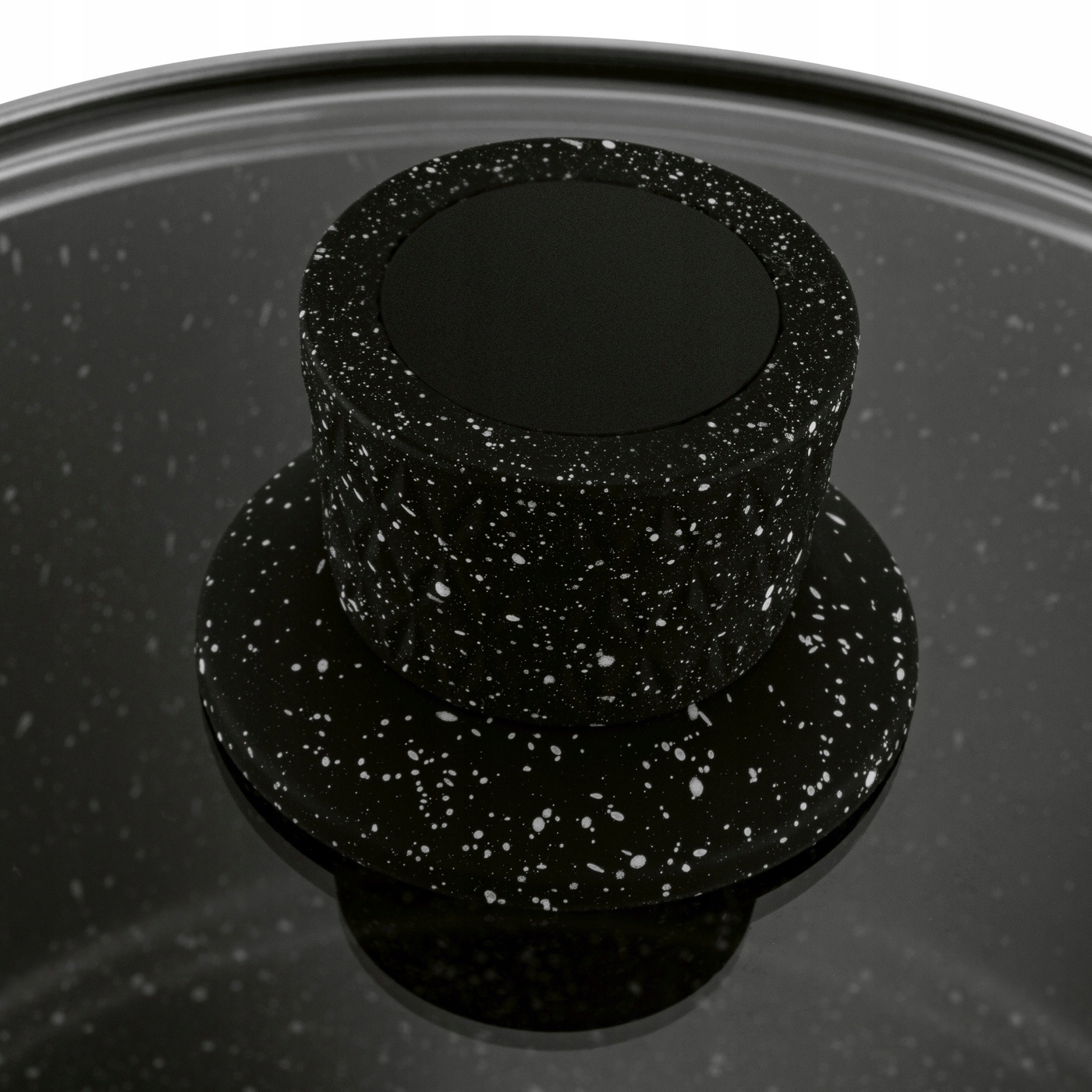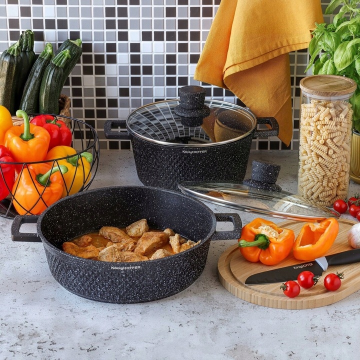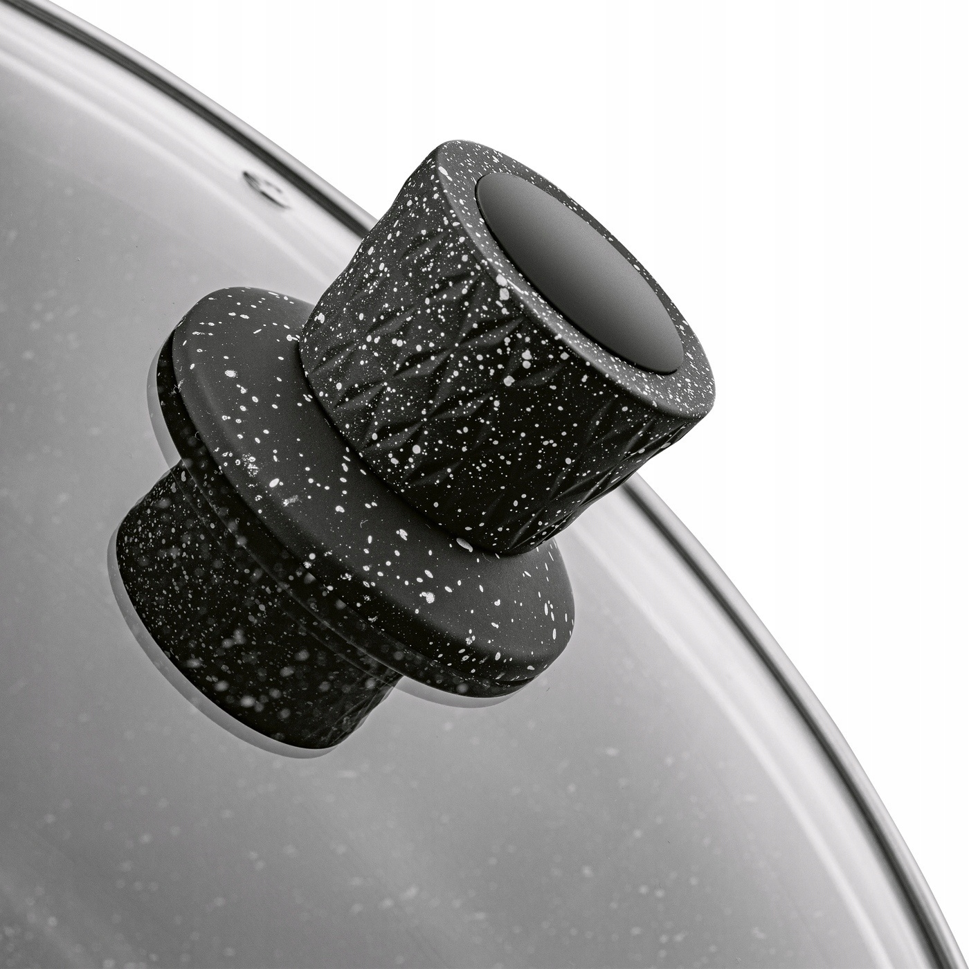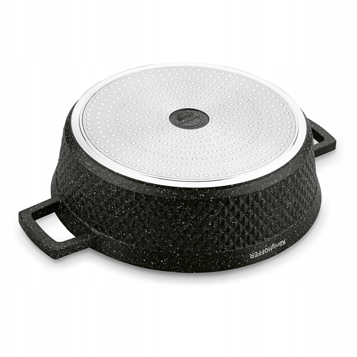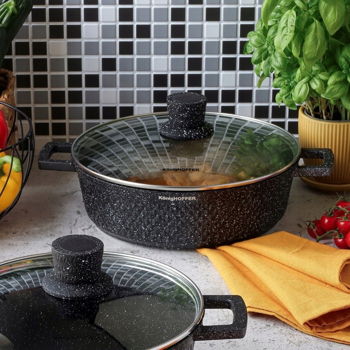 Мраморная сковорода Konighoffer Escuro диаметром 28 см отлично подойдет для большой домашней кухни. Продукт позволяет безопасно тушить и жарить. Низкая кастрюля комплектуется стеклянной крышкой со стальным ободом для защиты от сколов. Он также оснащен стильной, прохладной мягкой на ощупь ручкой с нескользящей поверхностью. На каменной сковороде Escuro можно готовить на плитах любого типа. Гранитное антипригарное покрытие и отделка алюминиевого корпуса под черный мрамор добавляют элегантности. Двухслойная структура антипригарного покрытия выдерживает до 5000 циклов истирания. Он быстро нагревается, поэтому вы сэкономите время и силы. Идеально подходит в качестве подарка. Он также хорошо защищен от высоких температур и равномерно проводит тепло. Вы также можете использовать его в духовке (максимум 220 градусов по Цельсию), если снимите крышку. Маркировка PFOA Free гарантирует безопасное использование и нетоксичность конструкции для окружающей среды. Литые ручки являются неотъемлемой частью корпуса сосуда. Поскольку никаких дополнительных соединений у них нет, то они нагреваются вместе с глубокой сковородой. Это обусловливает необходимость использования защитных чехлов (тканевых, силиконовых) или кухонных рукавиц при перемещении и снятии их с плиты и вынимании из духовки, чтобы не обжечь руки.