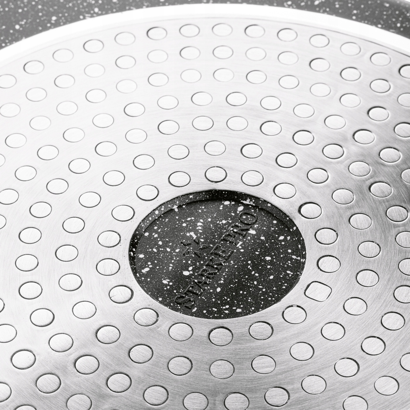 Сковорода Starke Pro Chelsea с антипригарным покрытием в мраморном стиле с покрытием Greblon® C3 шириной 20 см и подушечкой подарит каждому удовлетворение исключительной долговечностью и интенсивным использованием (трехслойное покрытие, устойчивое к истиранию, повреждениям и прилипанию). . Антипригарное покрытие позволяет использовать меньше жира и обеспечивает беспроблемную очистку. Отсутствие каких-либо производных тефлона (без ПФОК) делает его безопасным для здоровья. Подходит для любого типа плиты (газовой, электрической, керамической и индукционной). Изготовлен из алюминия позволяет быстрее готовить любимые блюда. Ненагревающаяся ручка Soft Touch обеспечивает безопасное использование сосуда. Накладка облегчает хранение сковороды, имитирующей рисунок гранита, без повреждений.