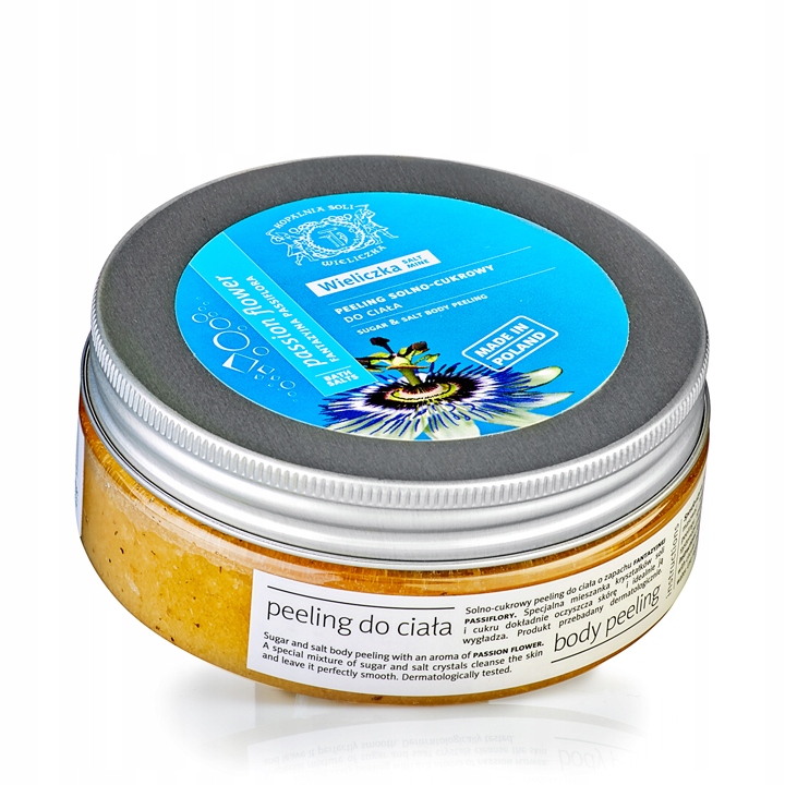 Солевой и сахарный пилинг с ароматом страстоцвета. Мягко очищает и разглаживает кожу.