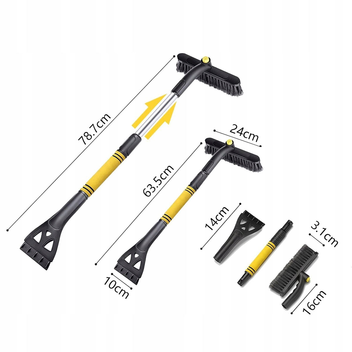Телескопический скребок - незаменимый инструмент для зимы!Эргономичный и удобныйв использовании, с регулируемой длиной от 63,5 до 78,7 см. Идеально подходит для быстрого и эффективного удаления снега и льда с транспортных средств.