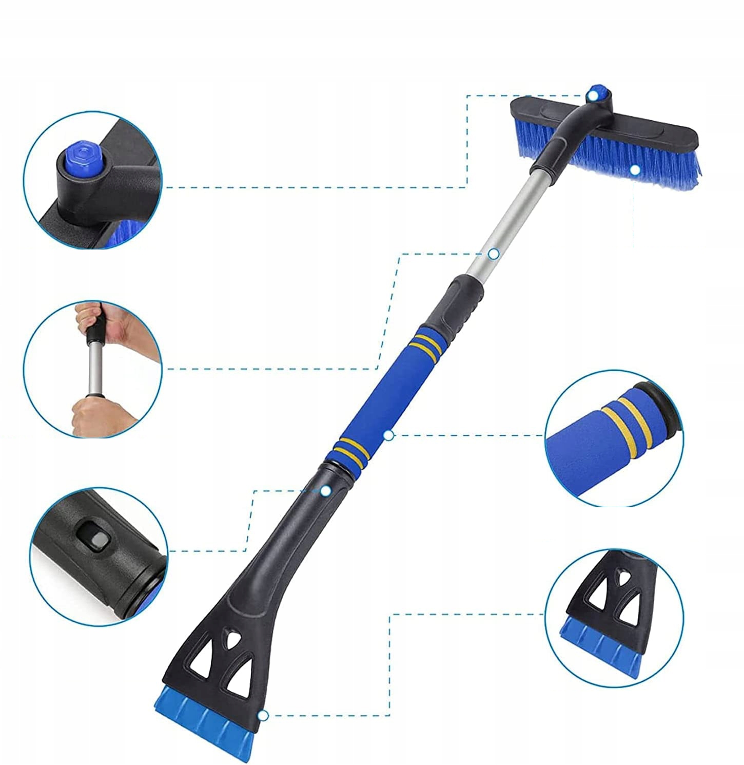 Инструмент состоит из трех элементов: скребка для льда, щетки для снега, вращающейся на 360°, и выдвижной штанги, благодаря которой можно добраться до всех элементов автомобиля. Возможность быстрой разборки облегчает хранение и транспортировку. Также можно использовать каждую часть отдельно, не соединяя их стержнем.