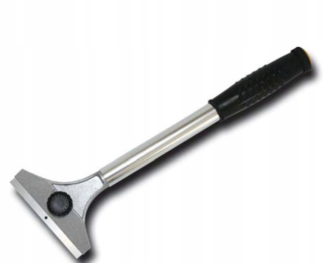 Скребок для металлических окон PROFI имеет металлический корпус, сменное и широкое 10 см лезвие и удлиненный ручка с нескользящим пластиковым покрытием, обеспечивающим удобство использования. Скребок для стекла используется для удаления сложных загрязнений с различных поверхностей. Он в основном предназначен для удаления пятен от красок, клеев, лаков и затирок. Тупая часть пригодится для удаления краски, шпаклевки и обоев со настенных покрытий, а острая сторона легко удалит краску, прилипшую к стеклу.