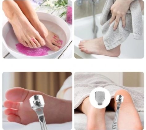 5. 【Совет】 Перед использованием инструмента для защиты ног рекомендуется замочить ноги в горячей воде на 10 минут. Смягчает омертвевшую кожу на подошвах ног, облегчая очистку. Не рекомендуется людям с тонкой кожей. Будьте осторожны при его использовании.