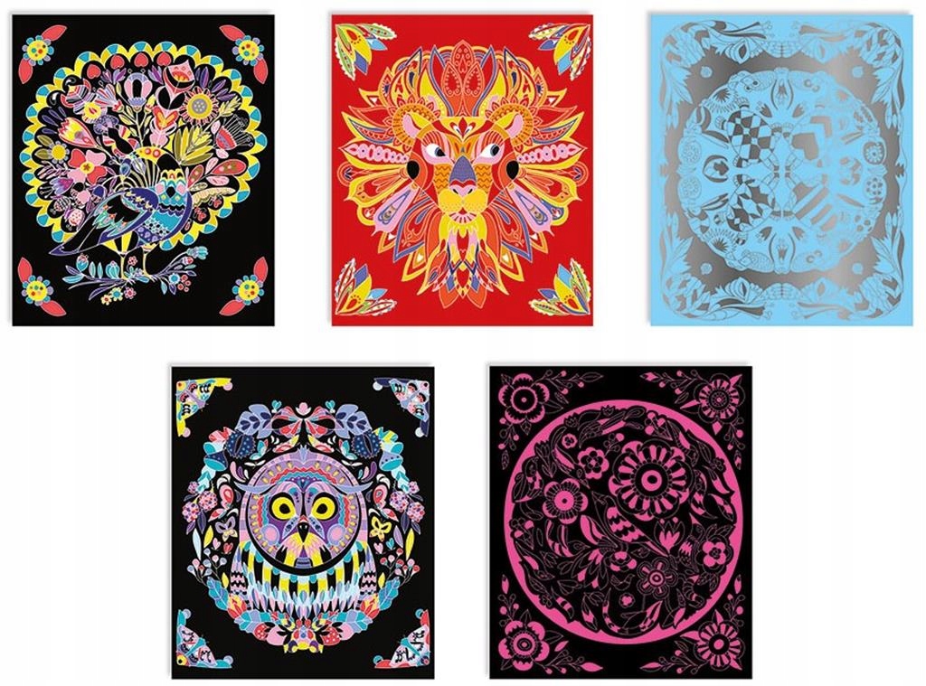Набор скретч-карт «Мандалы животных» содержит 5 скретч-досок с животными и растительными мотивами. Завораживающие, полные деталей картинки отмечены лишь контурами, которые нужно выцарапать по шаблону собственной задумки. Скретч-карты изготавливаются из плотного картона - после оформления в рамку или паспарту картинка может стать фантастическим украшением детской комнаты.