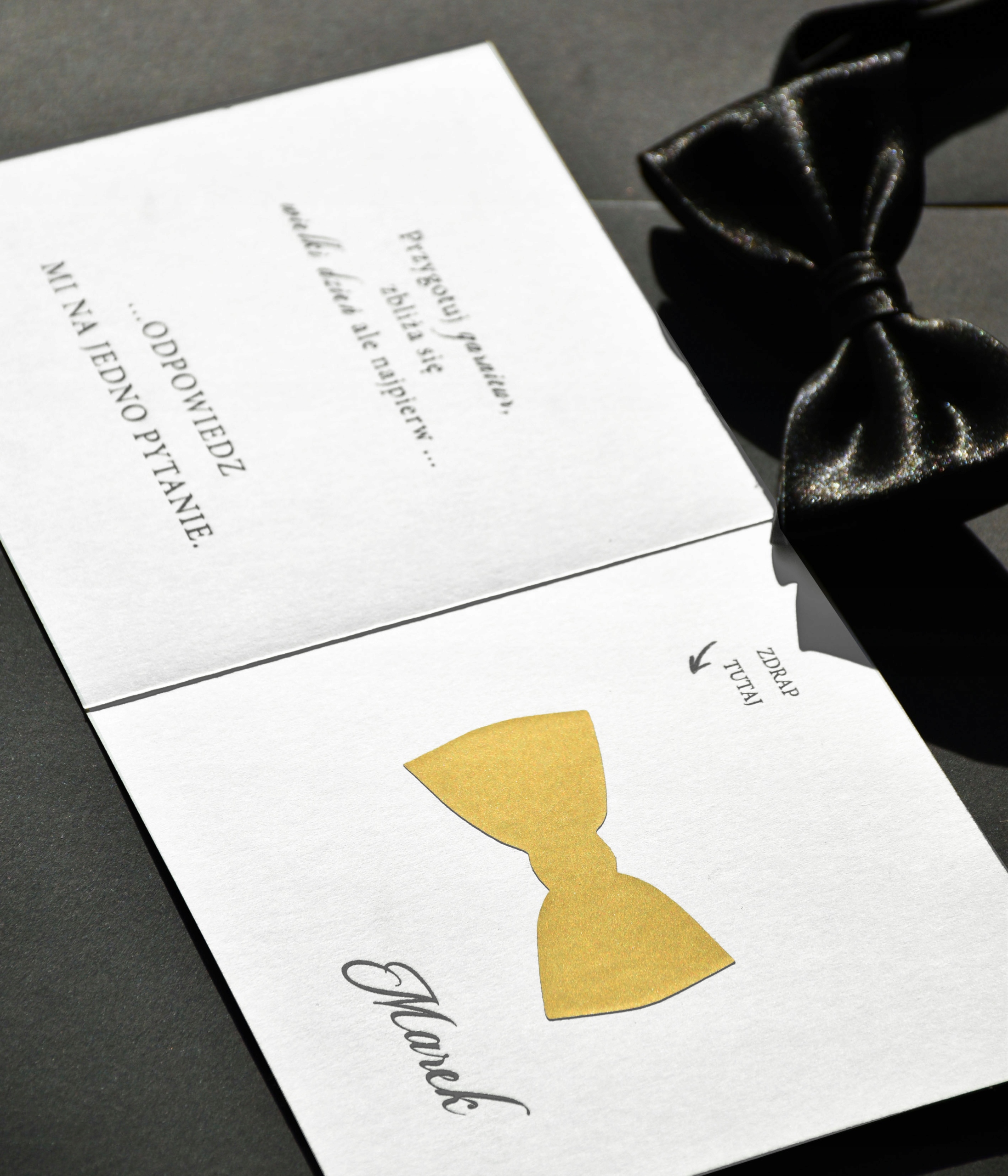 - Элегантную открытку с изображением мужской мухи и золотую скретч-карту с изображением надпись «ТЫ БУДЕШЬ МОИМ СВИДЕТЕЛЕМ?»