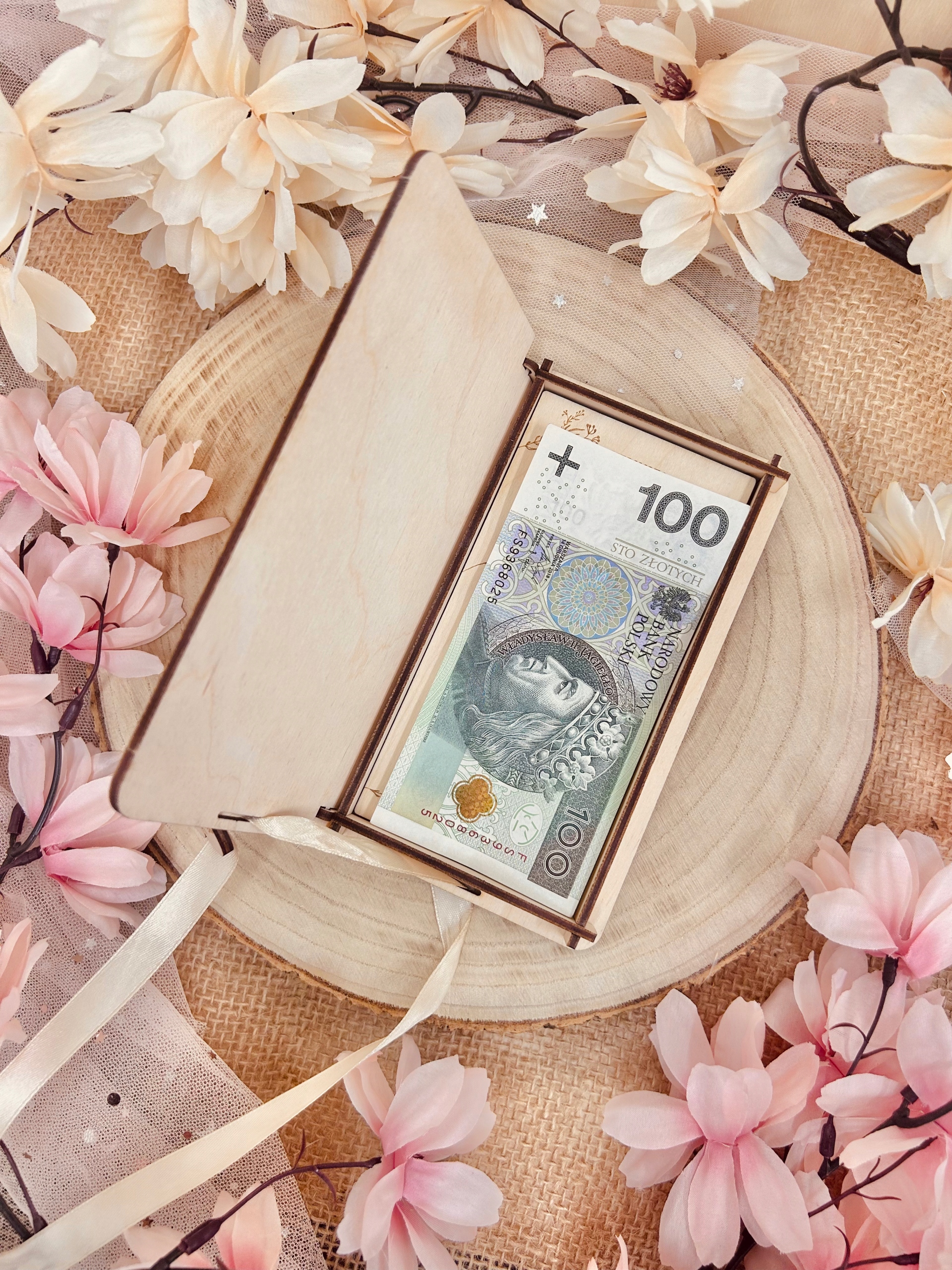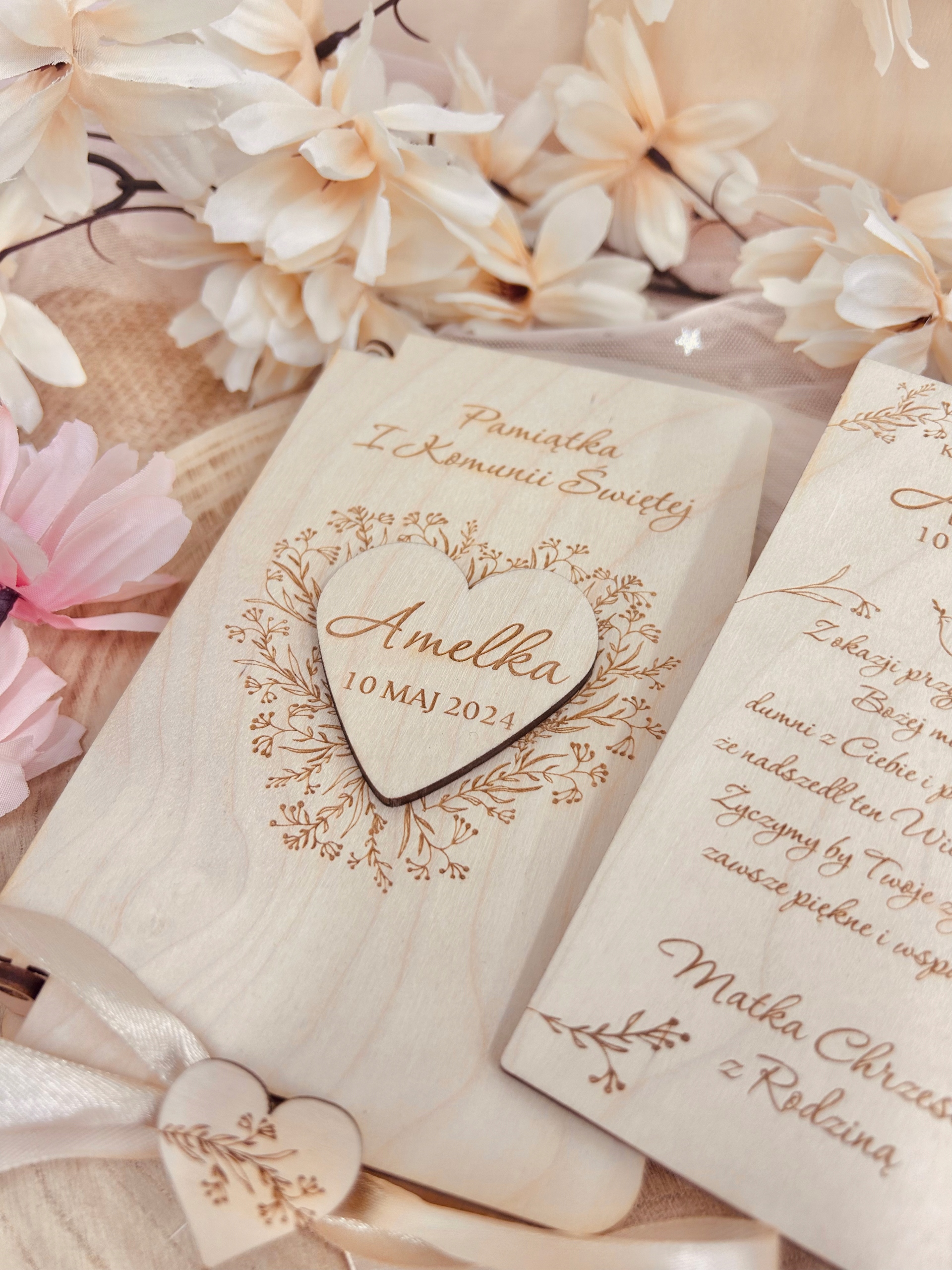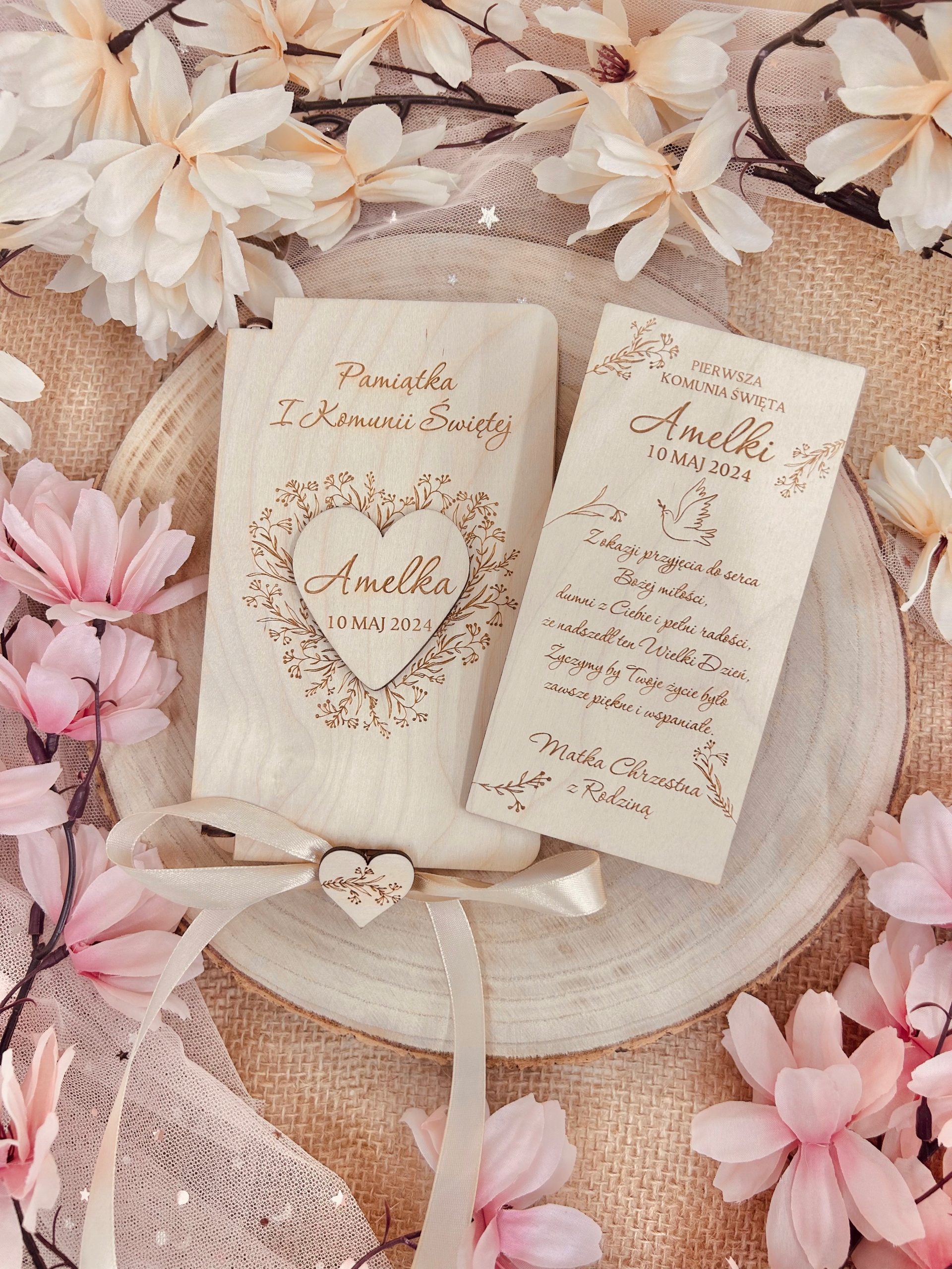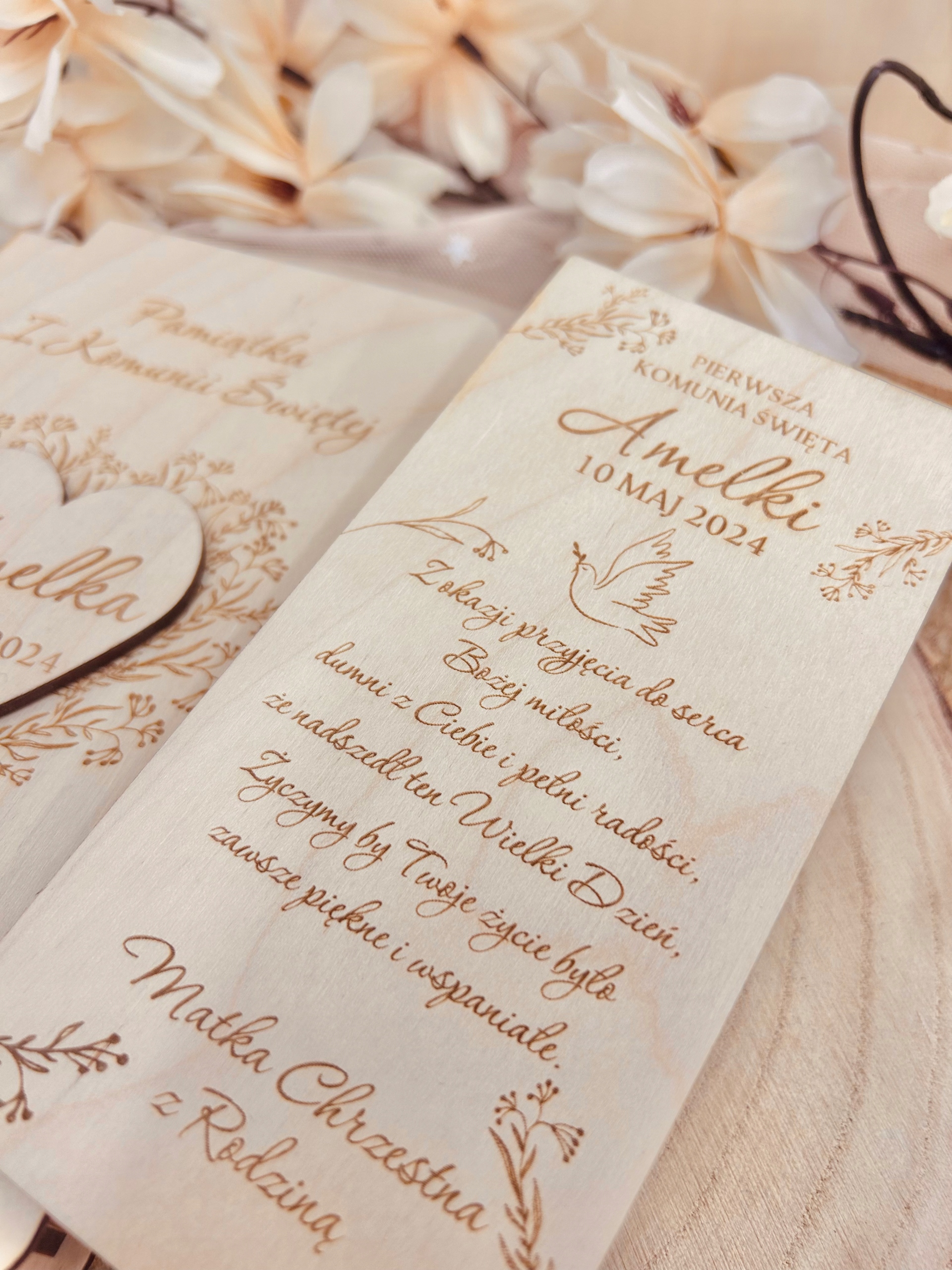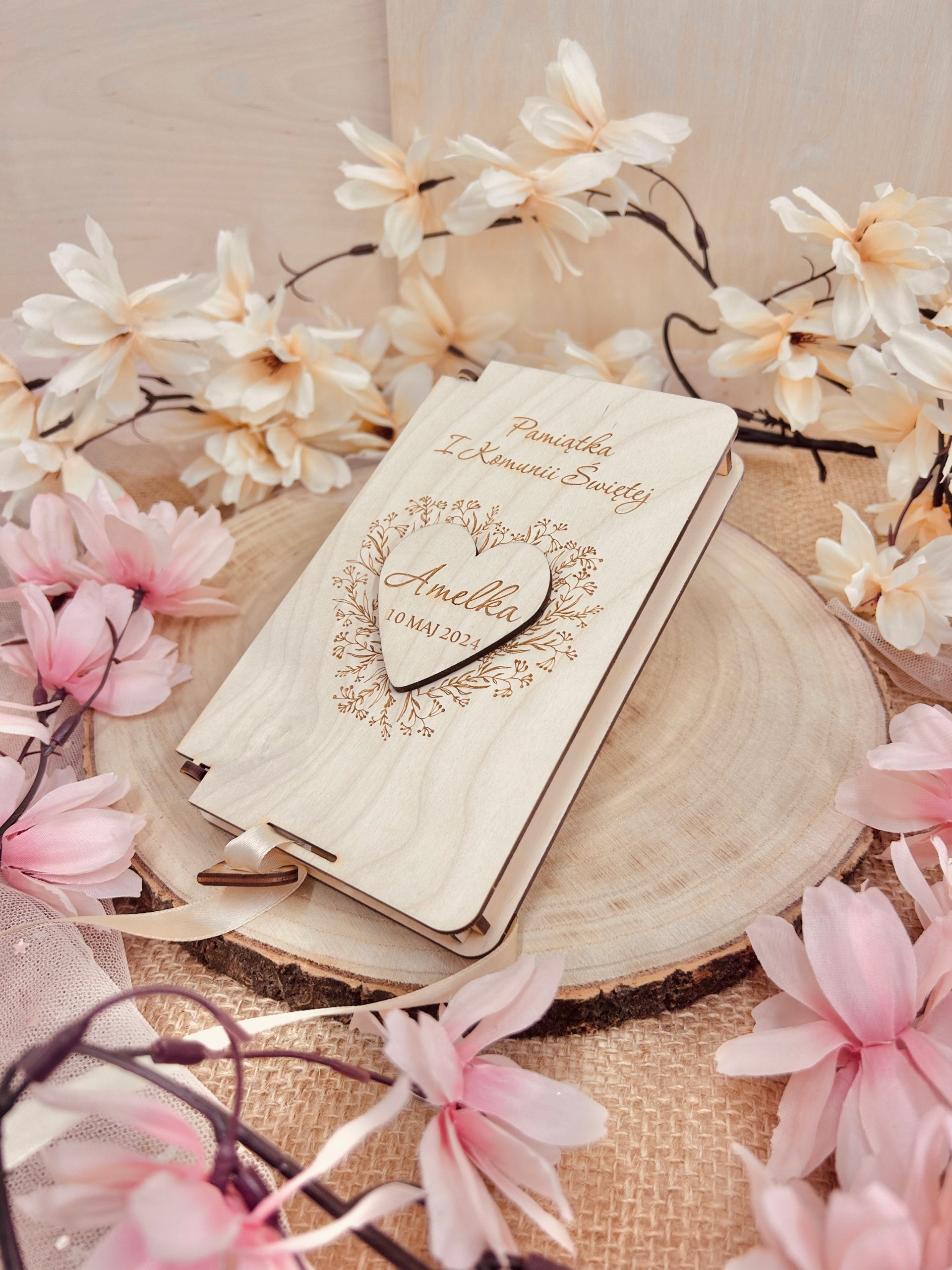 В коробке находятся пожелания и подпись, которую можно персонализировать. В коробку можно поместить банкноты и другие небольшие подарки, например цепочку. Имя ребенка и дата торжества выгравированы на внешней стороне коробки.