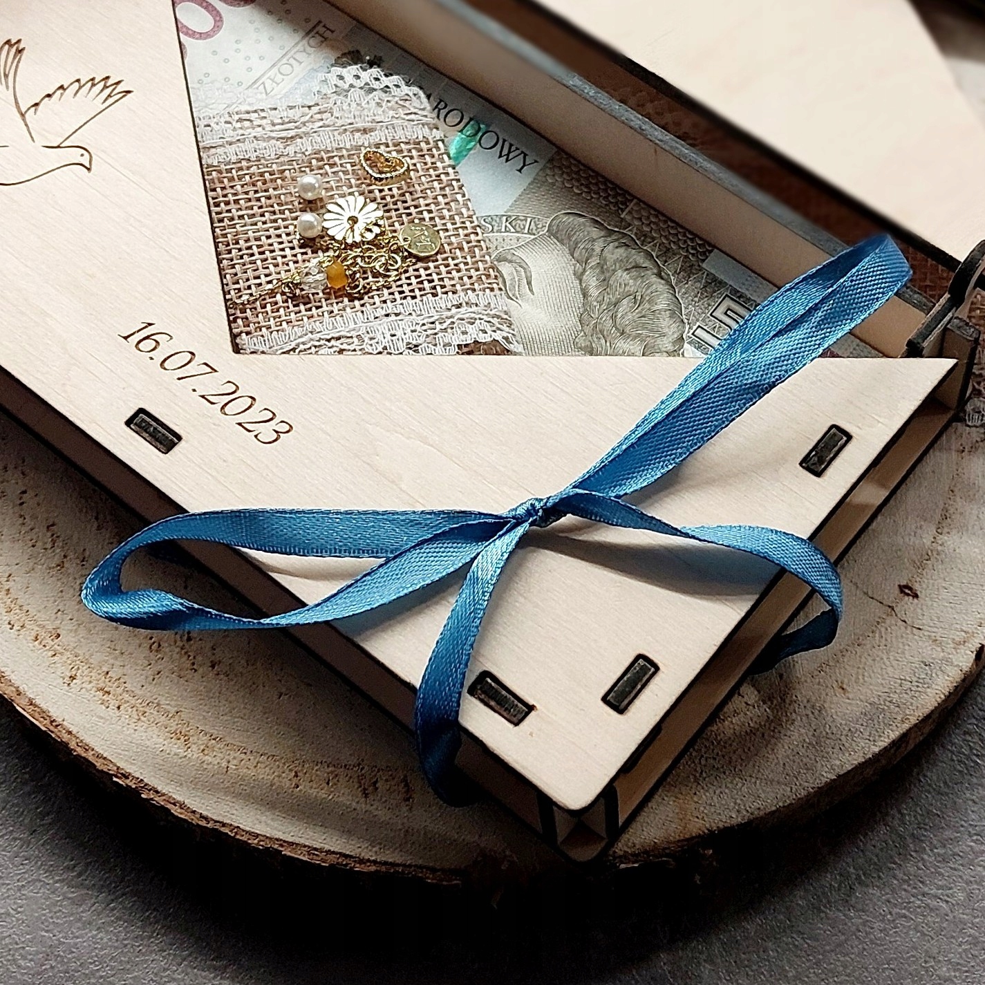 Элегантный деревянный конверт изготовлен из высококачественной натуральной древесины (берёзовой фанеры). Он вырезается лазером, а затем полируется вручную. В конверт можно поместить денежные купюры и другие небольшие подарки, например, цепочку, серьги и другие.