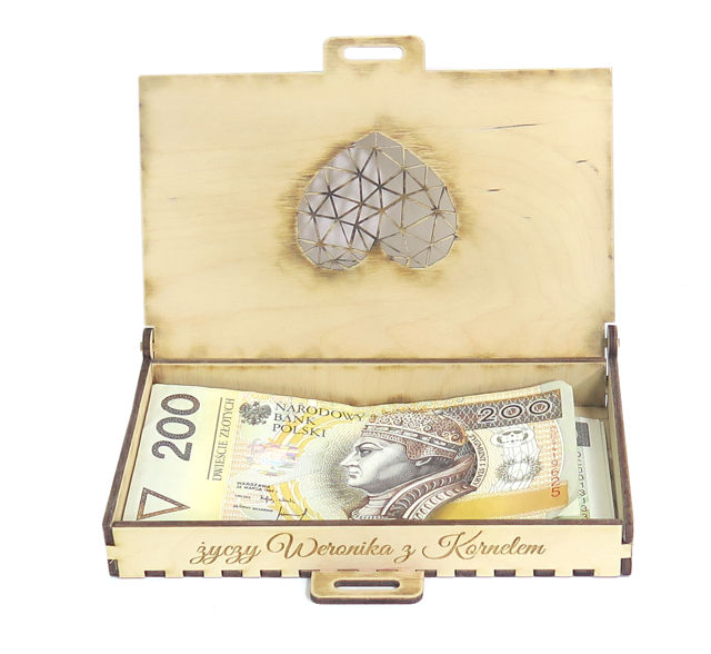 Коробку с внешними размерами: 161х86мм, высота: 21мм. Внутренние размеры: 155х80 мм, высота: 15 мм.Вмещает также банкноты номиналом 500 злотых.