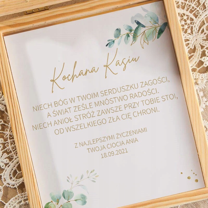 Крестильная копилка с красивым ботаническим мотивом ветки эвкалипта. Прекрасный способ подарить ребенку деньги в прочной коробке и подарить ему уникальный сувенир на долгие годы. В коробке находятся персонализированные открытки с эвкалиптовым мотивом и подписью – они идеально вписываются в тренды. Шкатулка будет уникальной как для мальчика, так и для девочки.