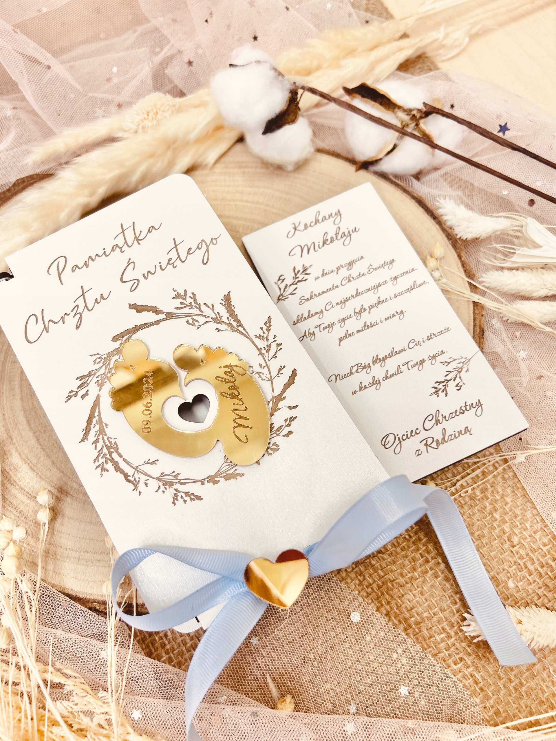 В коробочке пожелания и подпись, которую можно персонализировать. В коробку можно положить банкноты и другие небольшие подарки, например. цепь. Имя ребенка и дата торжества выгравированы на внешней стороне коробки.