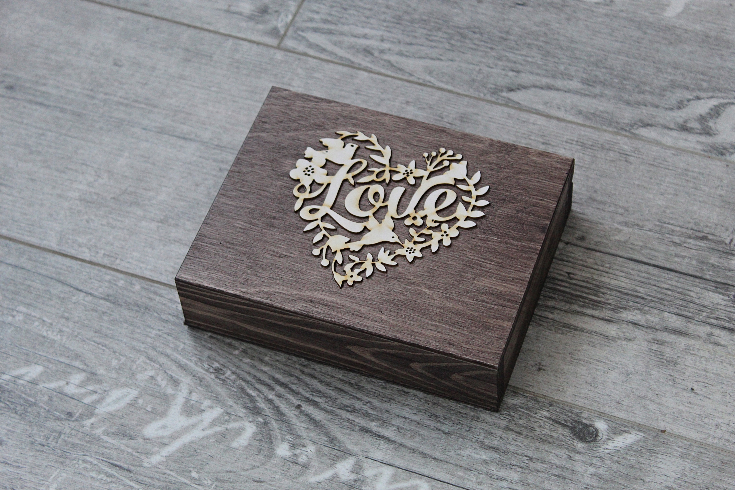 Продаем шкатулку для обручальных колец, изготовленную на заказ, окрашенную в цвет темного дерева (коричневый). Украшен декором (по вашему выбору) в натуральном цвете с инициалами и датой. С наполнением для стабильного и элегантного размещения белых обручальных колец.