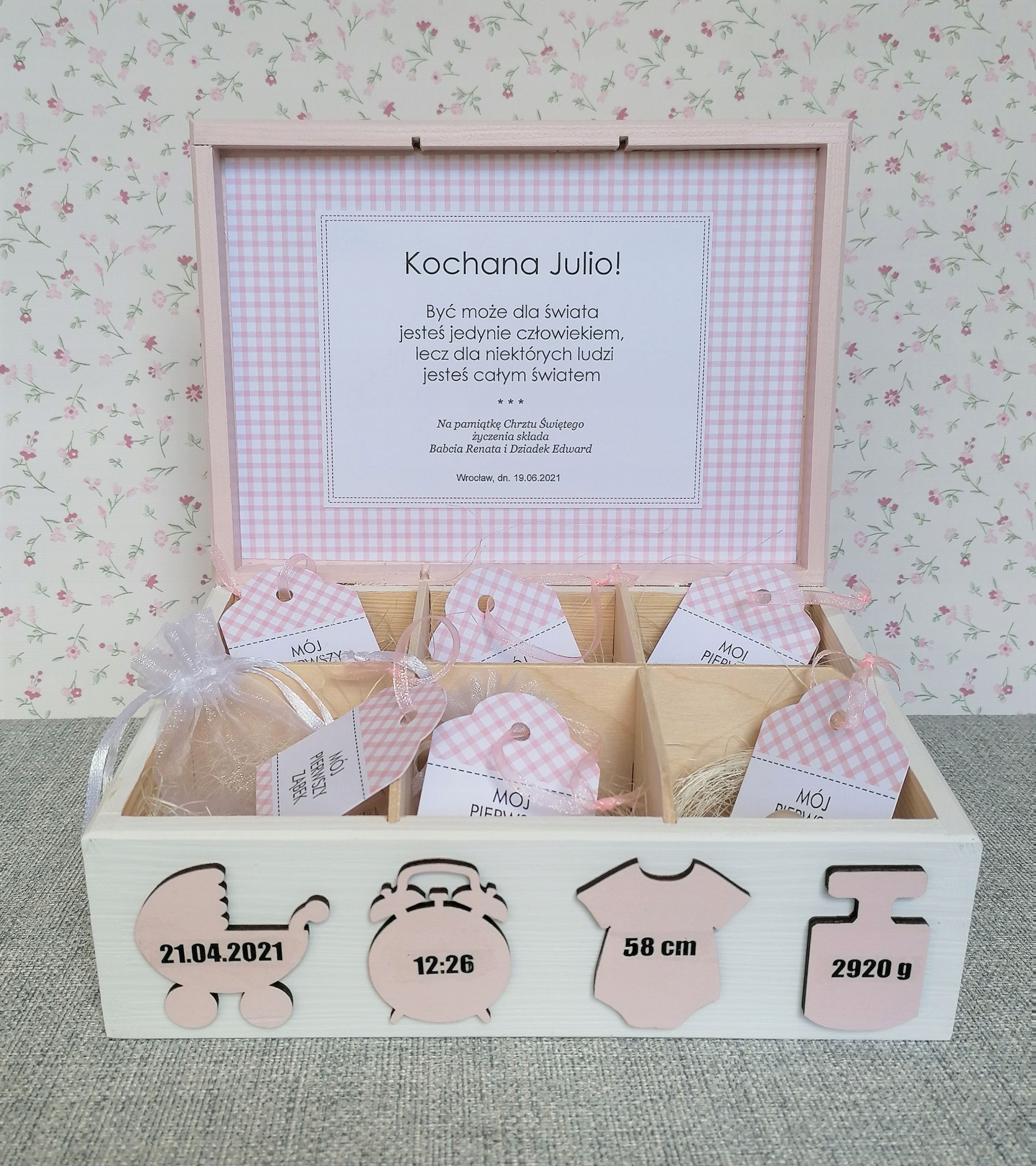 На крышке коробки, окрашенной в светло-розовый цвет, указано имя ребенка.