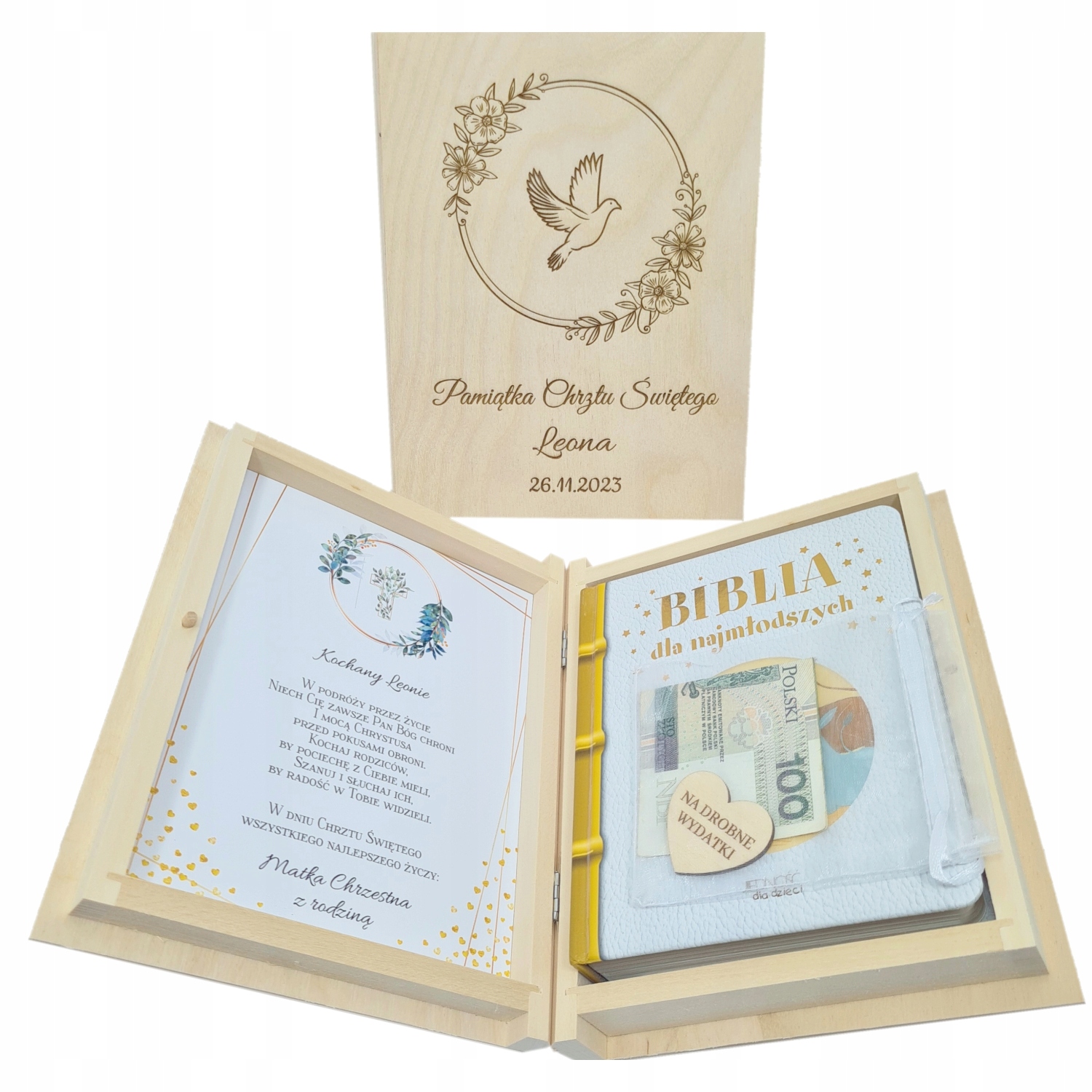 Внутри очаровательной коробочки пожелания с посвящением и «Библия для самых маленьких» в твердом переплете.