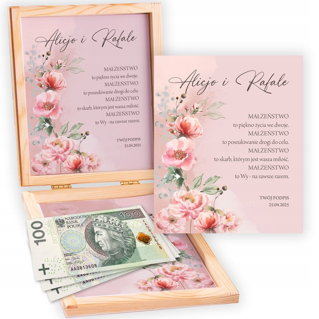 Уникальная шкатулка из дерева – элегантное предложение для свадебного подарка – оригинальная альтернатива классическому конверту. Внутри находится эстетичная композиция, состоящая из двух открыток: одна с индивидуальными пожеланиями, другая с графикой, изображающей нежные розовые цветы в пастельных тонах. Все это создает целостный романтический комплект, который жених и невеста могут сохранить как уникальный сувенир.