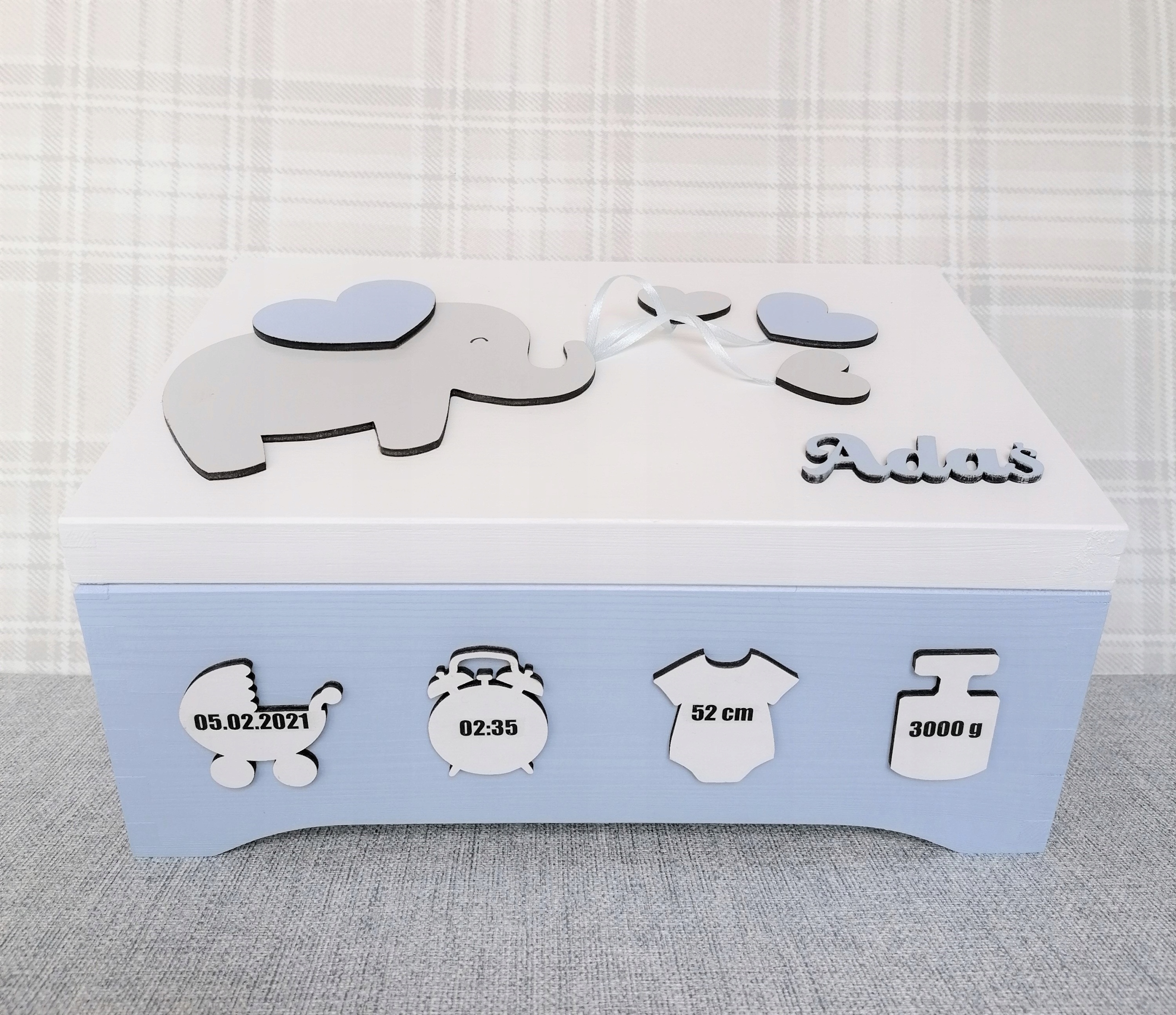 На крышке коробки, окрашенной в белый цвет, изображен серый слоник и имя ребенка.