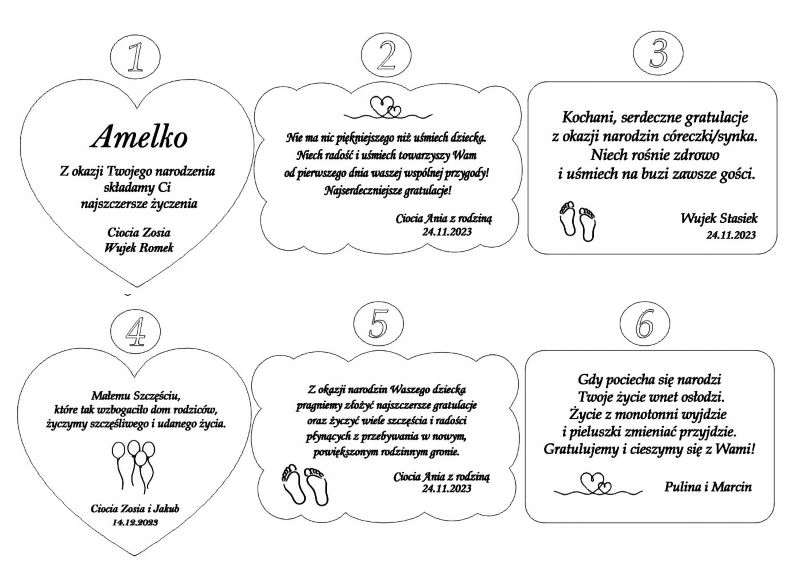 Вы можете выбрать пожелания и посвящения из представленных здесь дизайнов от 1 до 6, или предложить свои