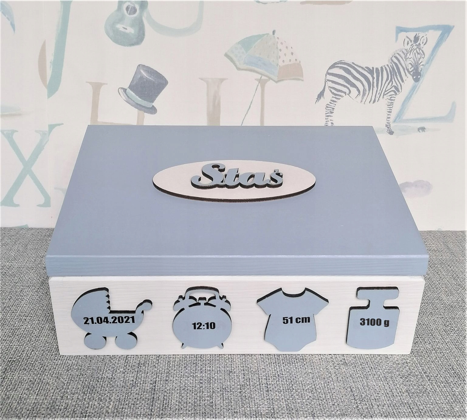На внешней стенке коробки указано имя и свидетельство о рождении с данными ребенка.