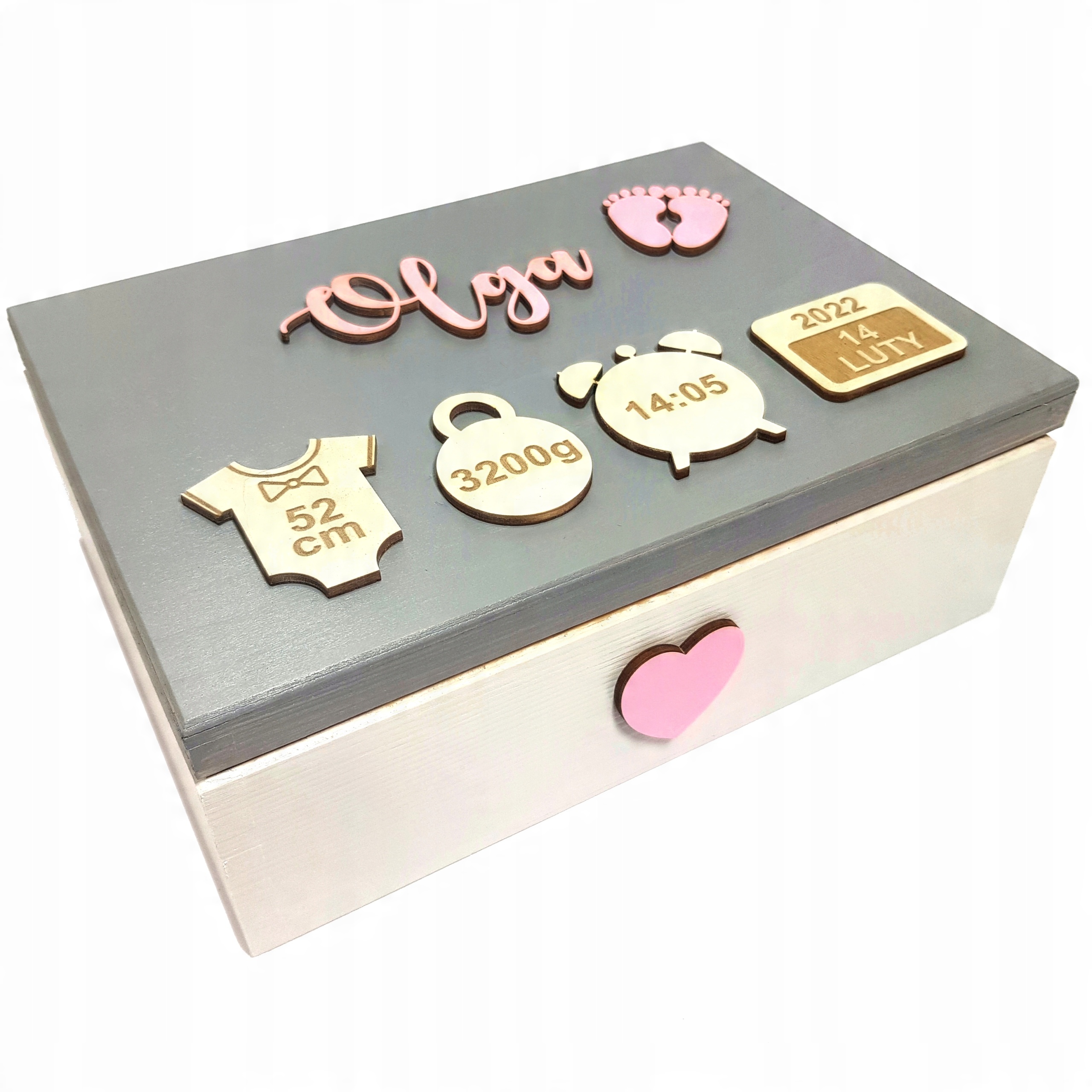Деревянная шкатулка с гравированной пластиной HDF внутри, вырезанной лазером надписью и элементами в верхней части. Коробка светло-темно-серая, как на фото. Имя, ноги и сердце розового или голубого цвета. Внутри 6 отделений, наполненных древесной ватой и 6 табличек с любой надписью.
