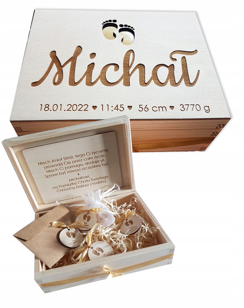 Вместо свидетельства о рождении можно поставить надпись, например Моя первый год, Коробка воспоминаний или сувенир на крещение и дата. - (Напишите в сообщении.)