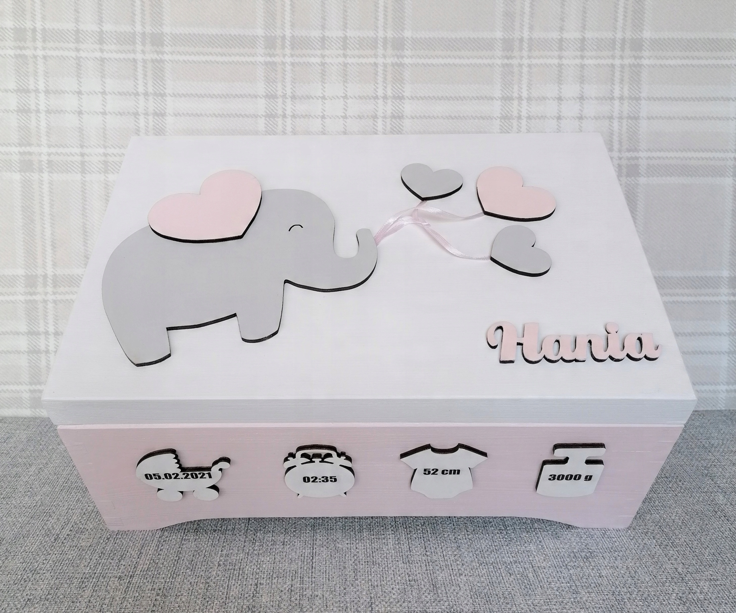 На крышке коробки, окрашенной в белый цвет, изображен серый слоник и имя ребенка.
