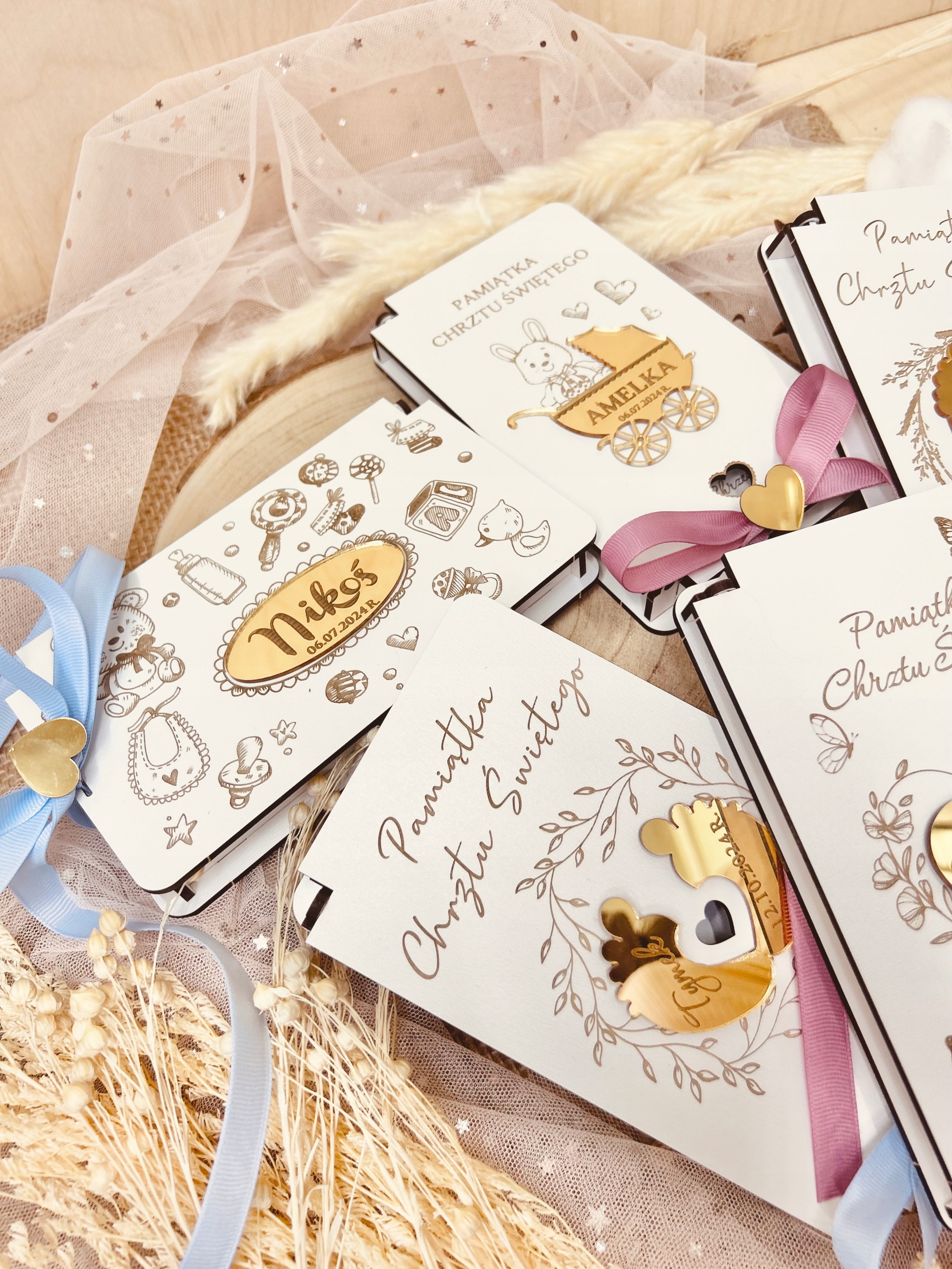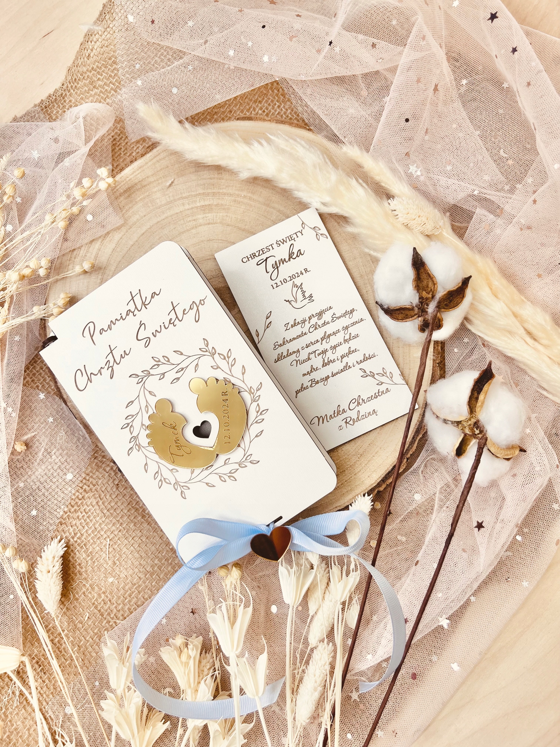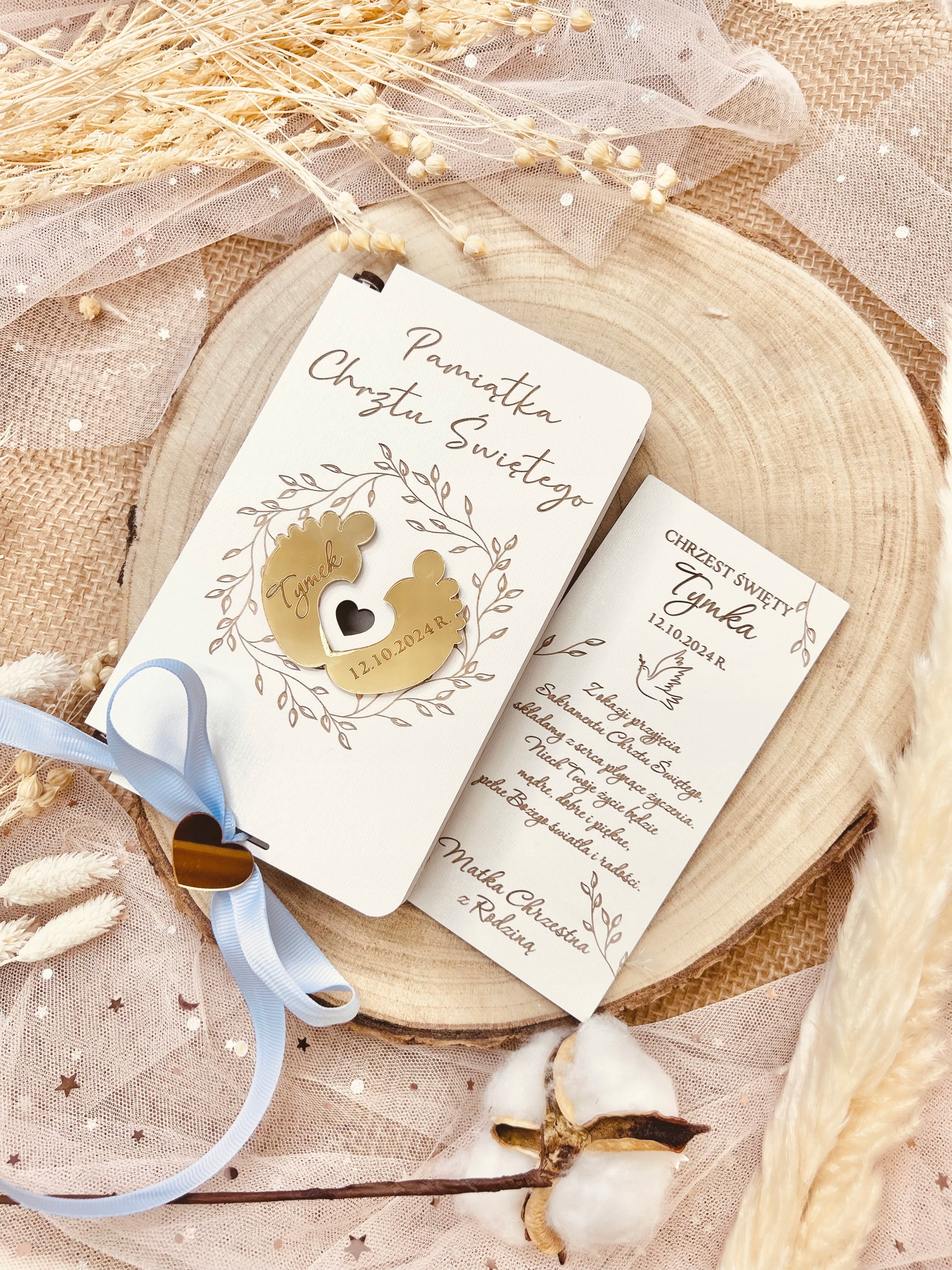 В коробочке пожелания и подпись, которую можно персонализировать. В коробку можно положить купюры и другие небольшие подарки, например цепочку. Имя ребенка и дата торжества выгравированы на внешней стороне коробки.
