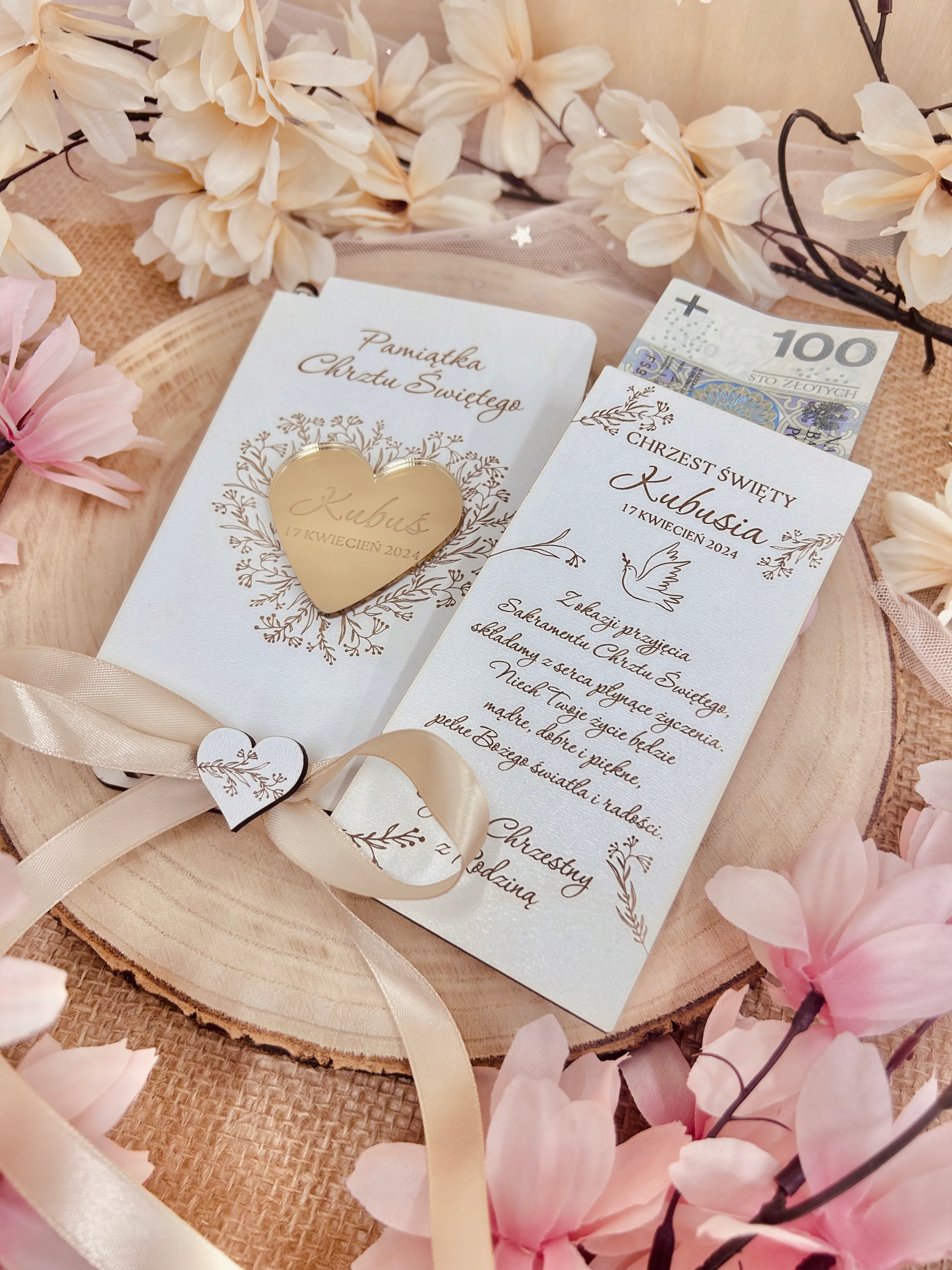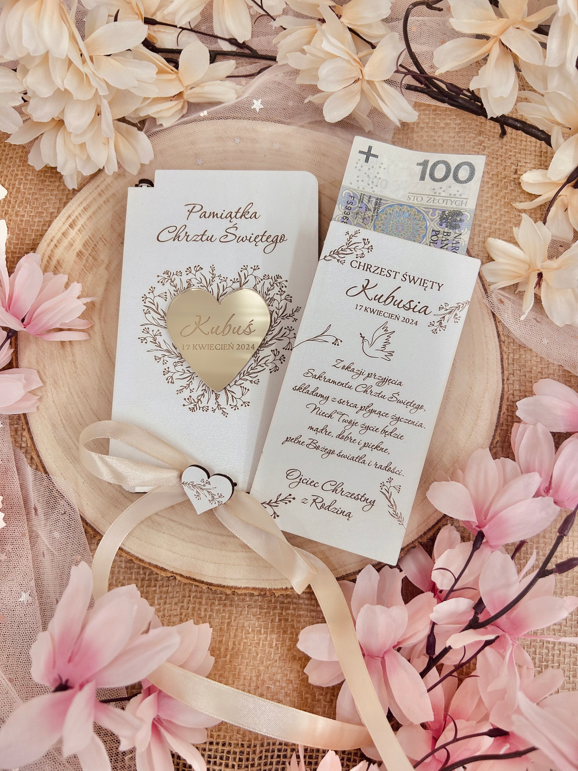 В коробке есть пожелания и подпись, которые подлежат персонализации. Банкноты и другие небольшие подарки, например, Цепочка поместится в коробку. Вне коробки выгравируются имя ребенка и дата церемонии.