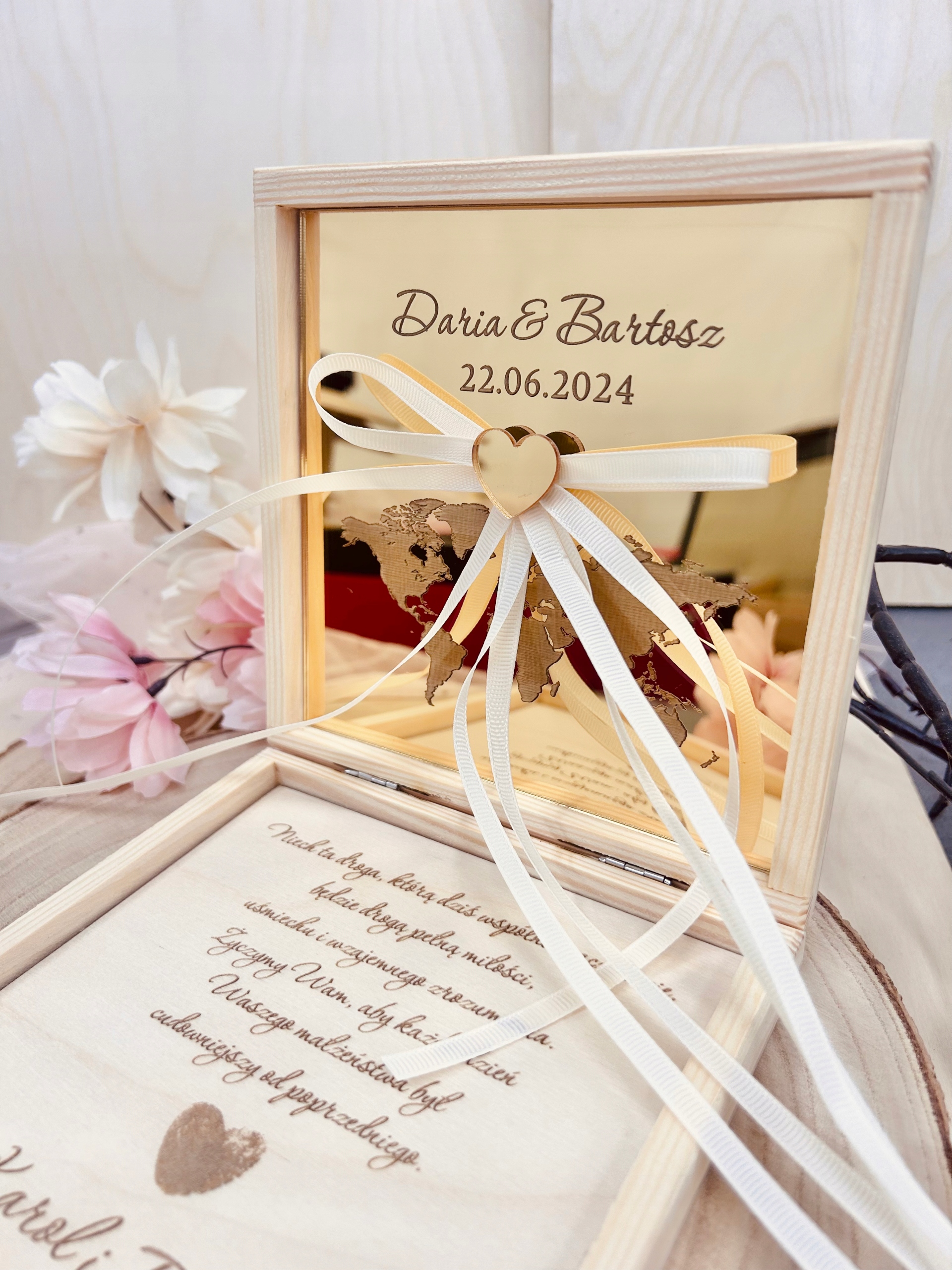 Сувенир в виде коробочки – уникальная идея подарка. Изделие изготовлено из дерева и золотого акрилового зеркала. Сувенир изготовлен на заказ. Это уникальный подарок и красивый сувенир для жениха и невесты.