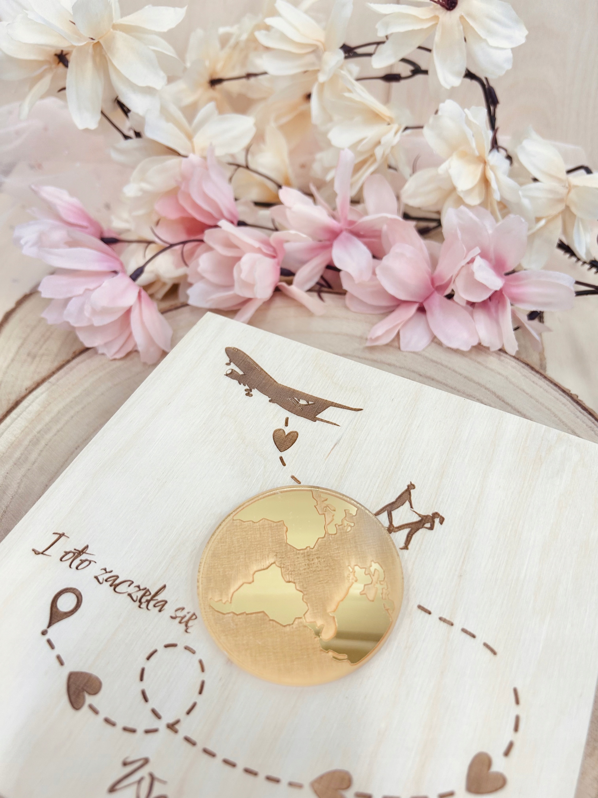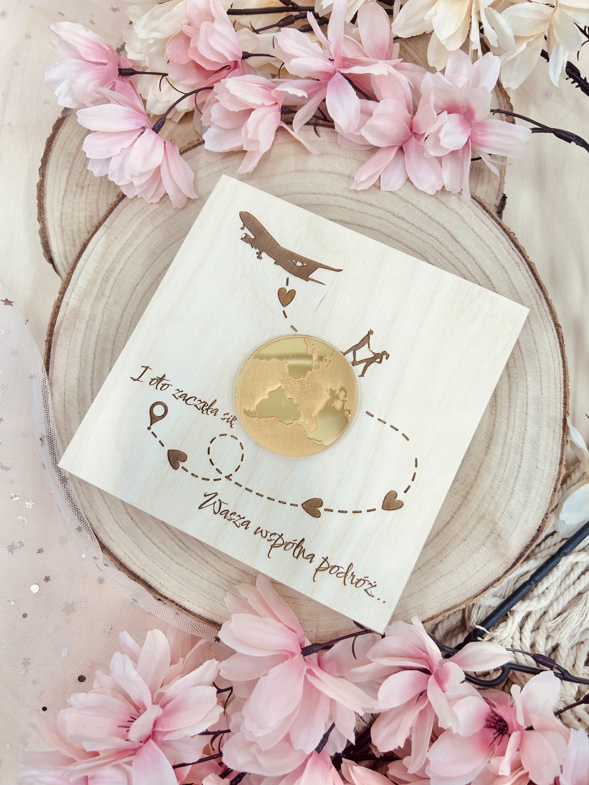 В коробочке пожелания и подпись, которую можно персонализировать. На золотой стенке шкатулки выгравированы имена жениха и невесты и дата свадебной церемонии. В коробку можно положить банкноты и другие небольшие подарки, например, скретч-карты или купоны.