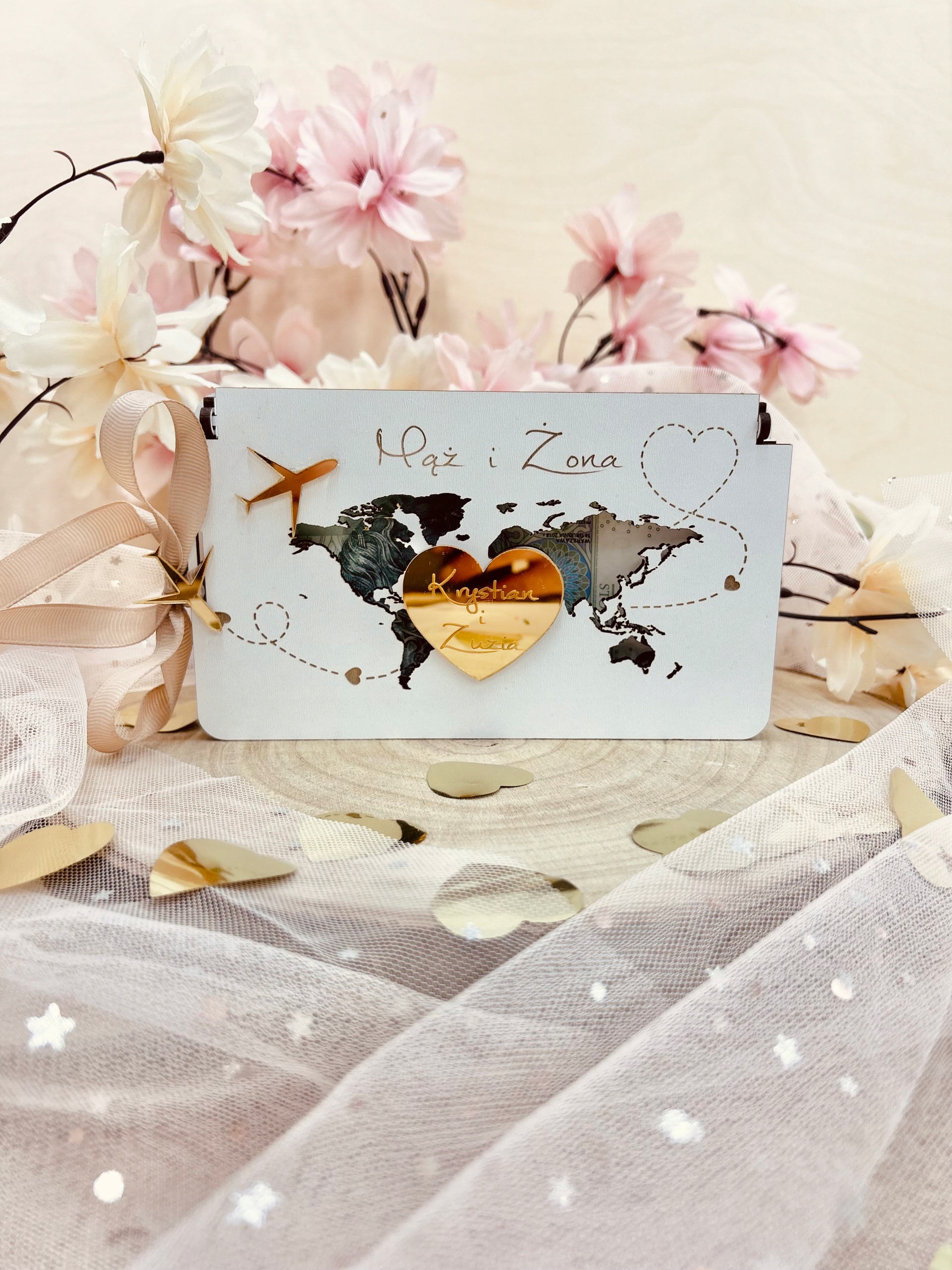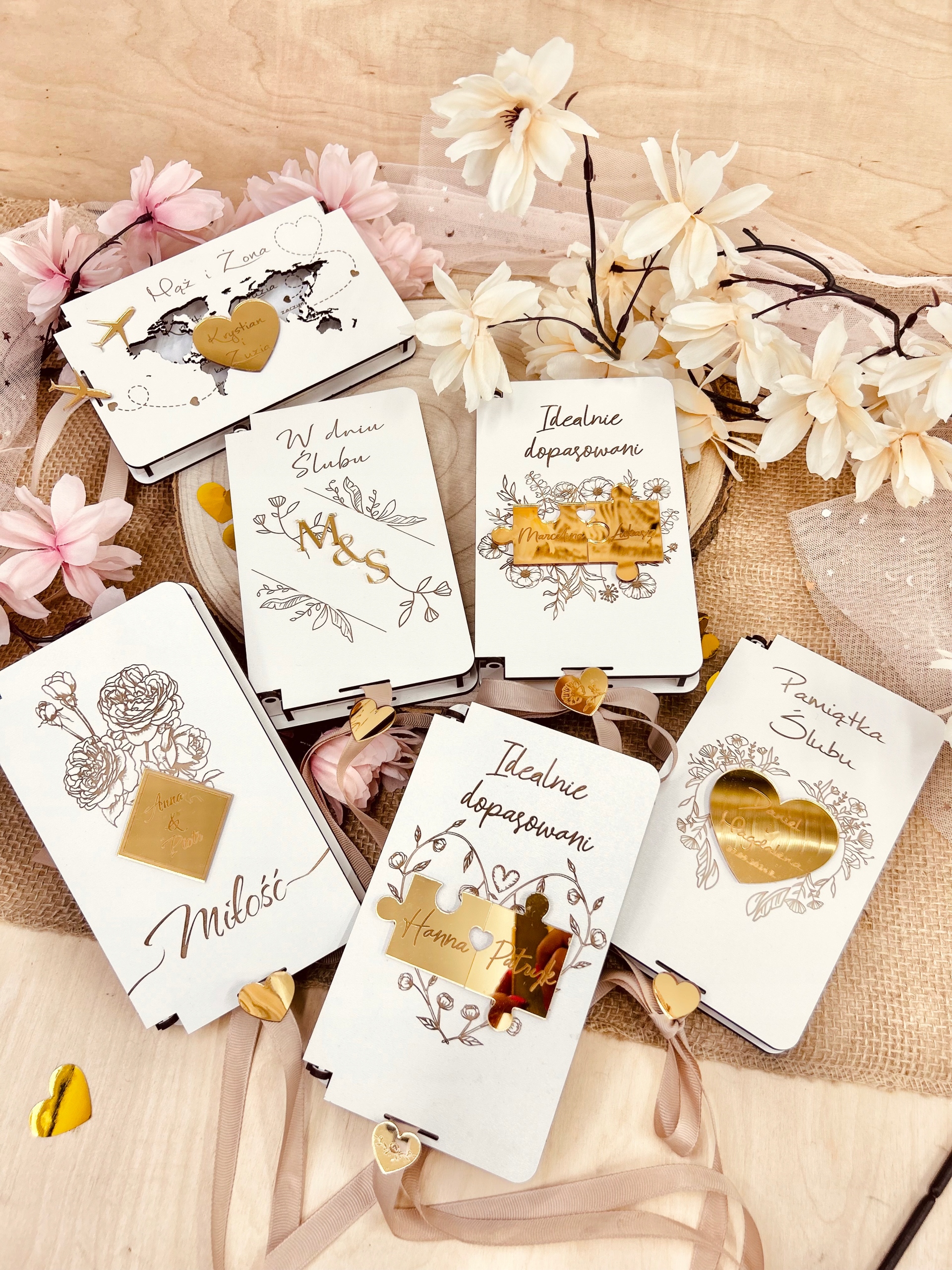 На коробочке указаны имена жениха и невесты, дата церемонии, пожелания и подпись, которую можно персонализировать. В коробку можно поместить банкноты и другие небольшие подарки, например, скретч-карты или купоны.