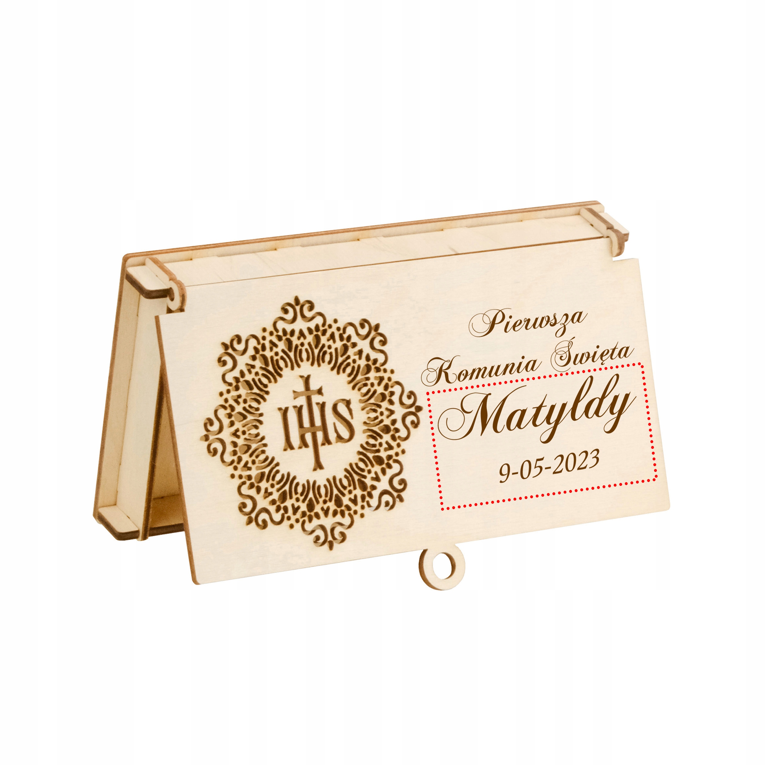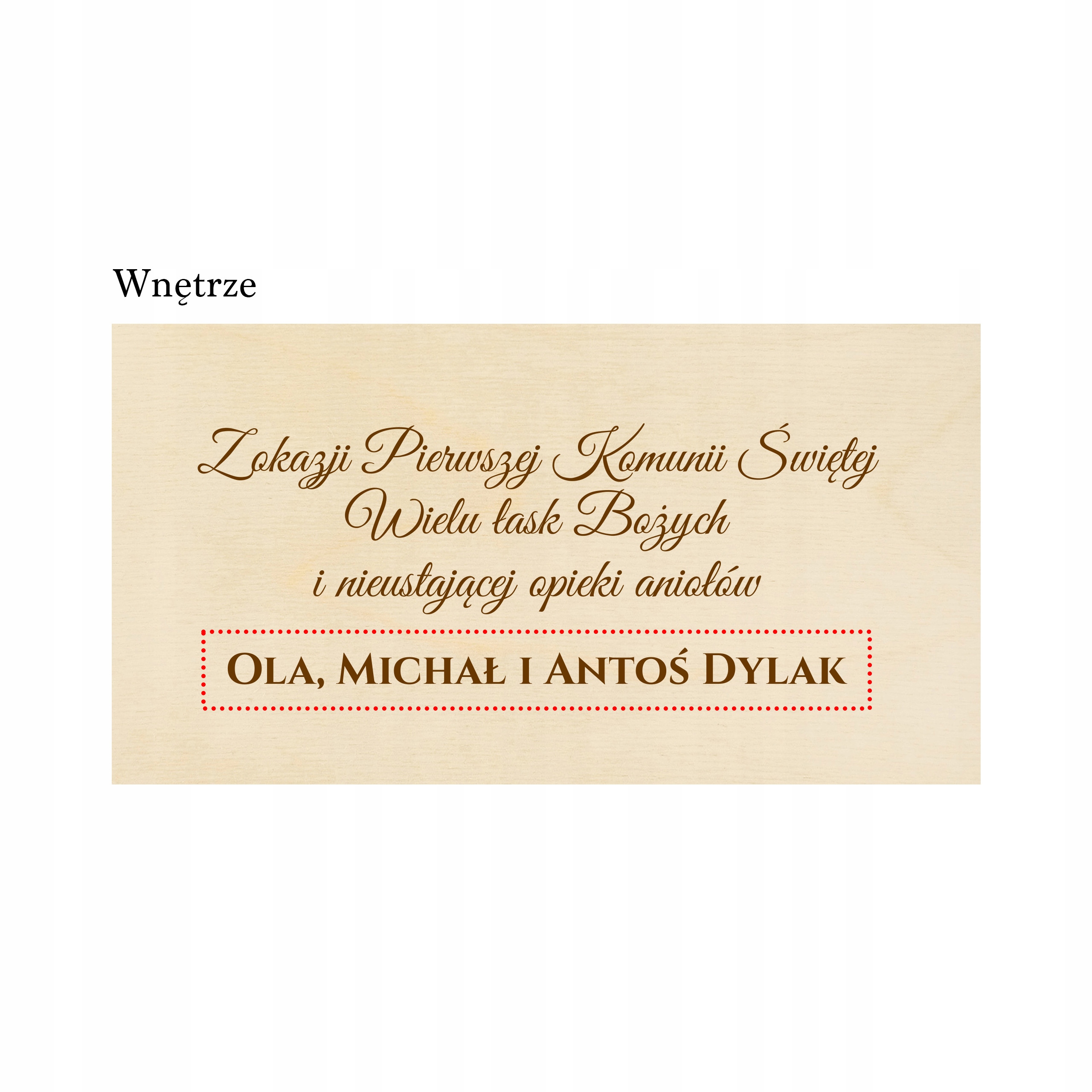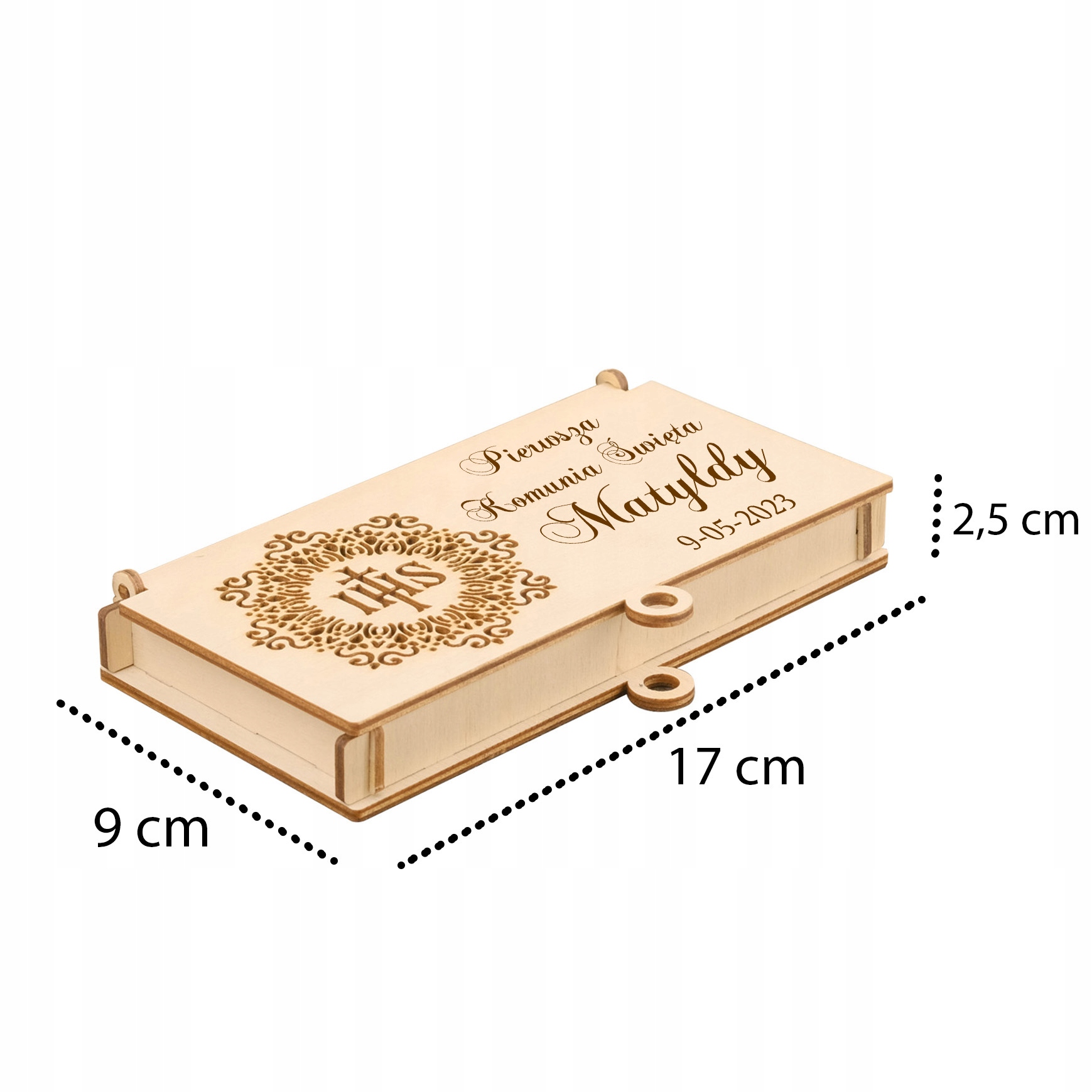 Персонализированная коробка выполняет две функции. Это стильный футляр для банкнот, а выгравированные на нем пожелания заменяют обычную открытку. Такое решение – отличный сувенир на причастие ребенку.