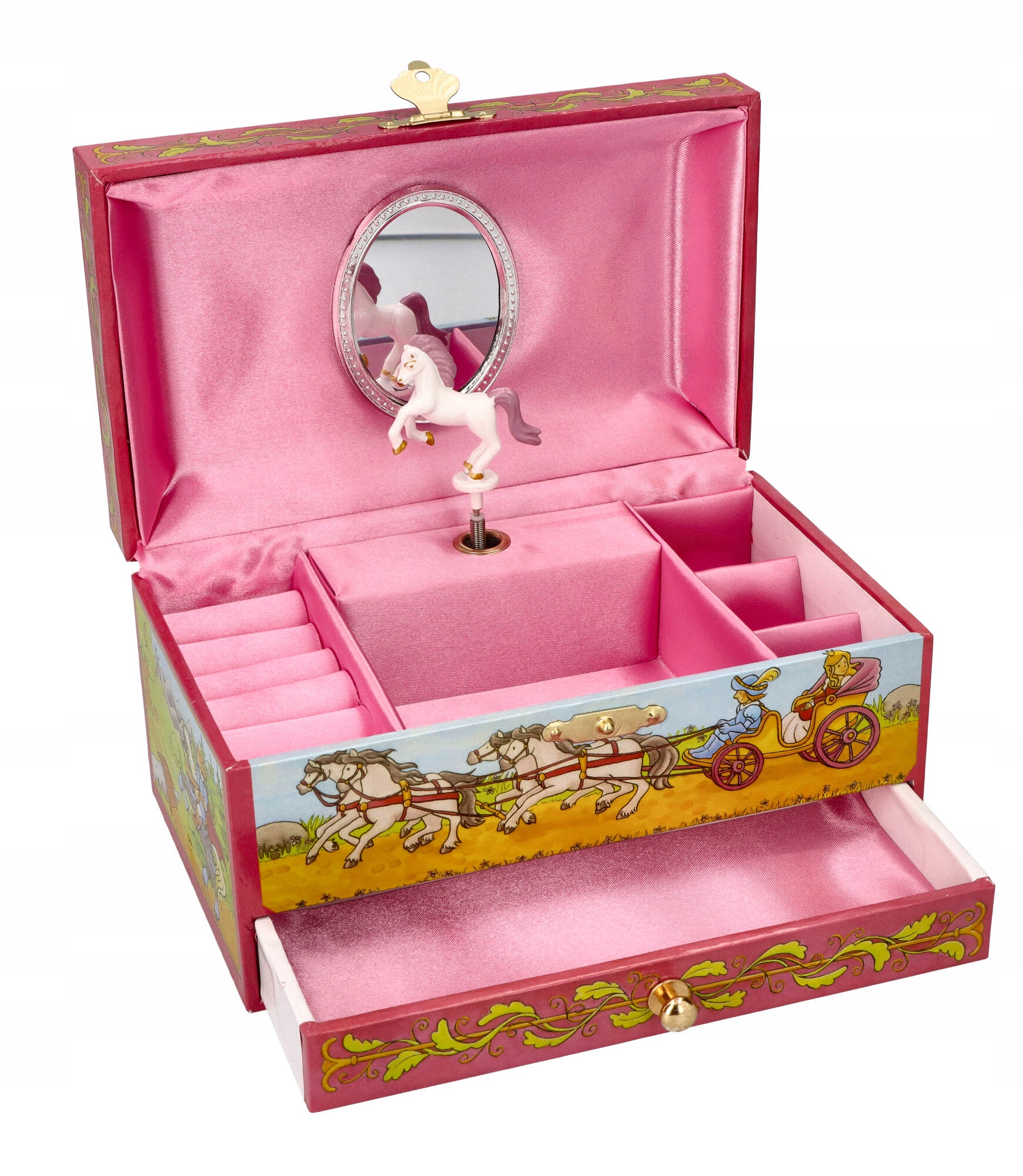 На внутренней стороне крышки установлено декоративное зеркало. Открыв крышку, ребенок увидит фигурку лошади, которая при заводке начнет вращаться в такт знаменитой мелодии Петра Чайковского - «Лебединое озеро».