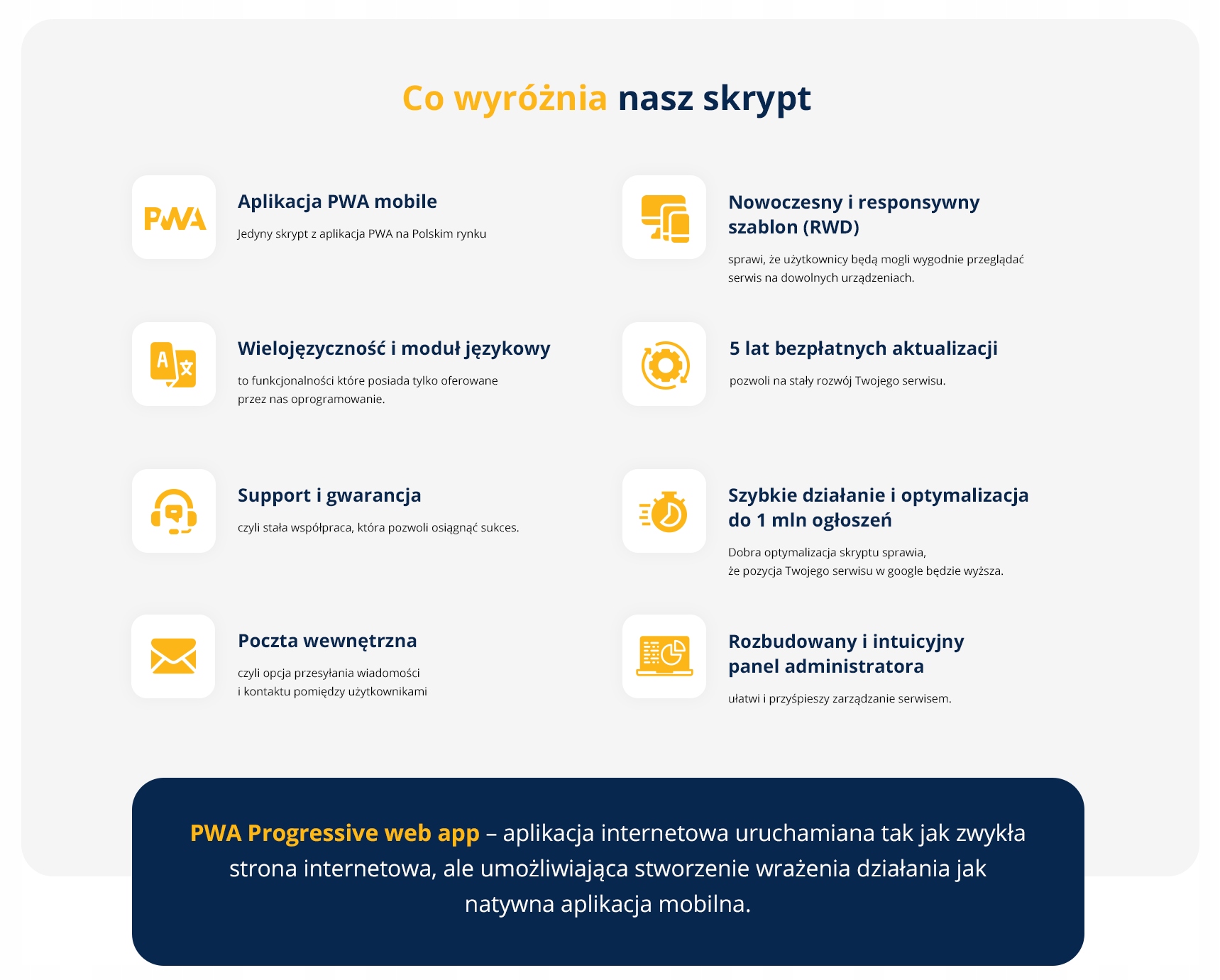 Мы предлагаем единственный на рынке такой обширный, многоязычный и универсальный скрипт RWD Advertisements. Его самым большим преимуществом является возможность широкого применения благодаря персонализации. Административная панель позволяет любое разделение регионов на: страны, воеводства, уезды, гмины, города, районы - это означает, что скрипт можно использовать для зарубежного, отечественного, регионального, городского или отраслевого портала.