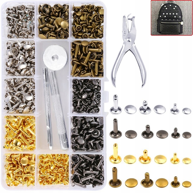 - включены в набор из 360 наборов двойных заклепок в 4 разных размерах.